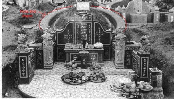 The above is an elaborate burial site. Notice the horse shoe shaped support? This burial site is in accordance to the Feng Shui concept of a strong support of the protective back of a grave site or Yin Feng Shui.