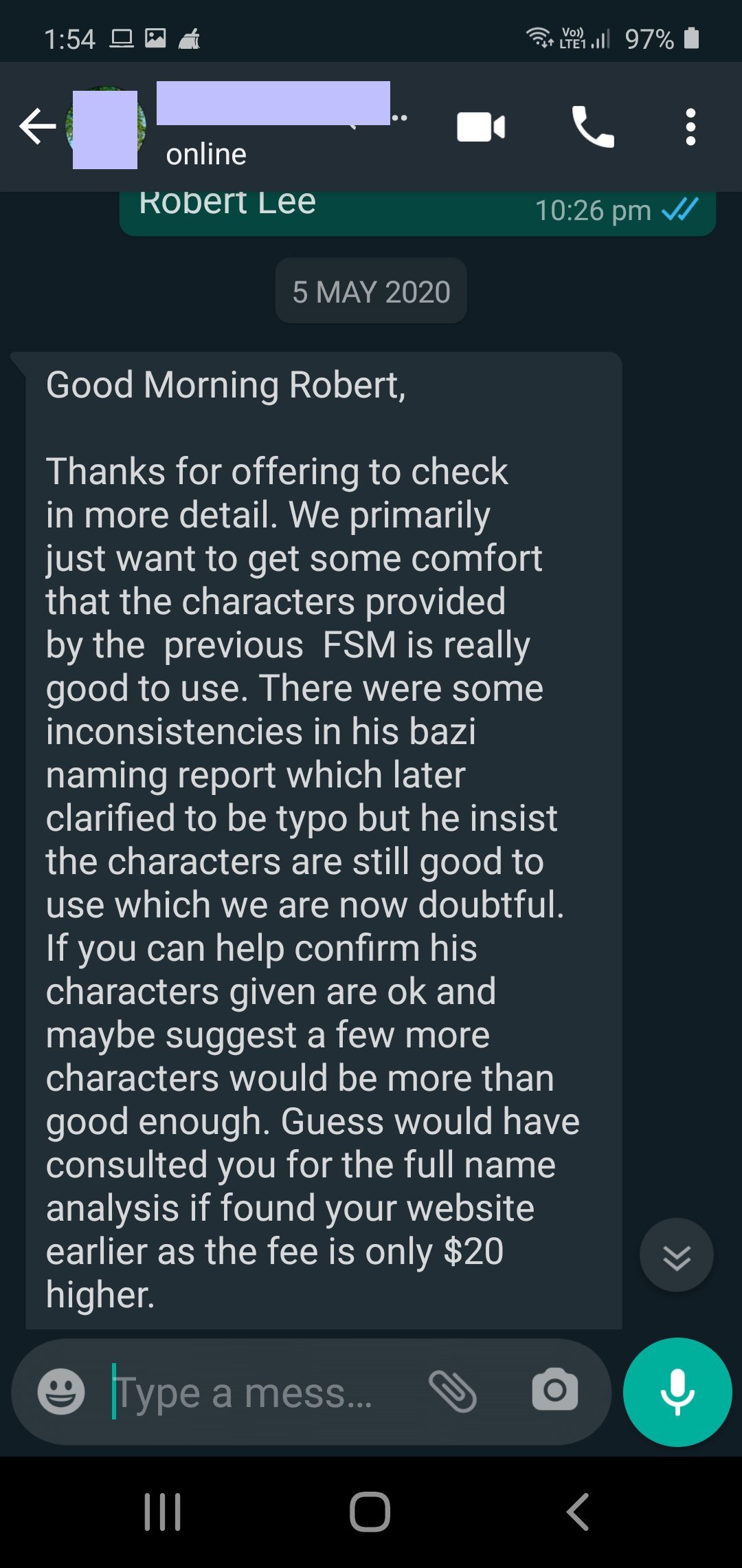 8. So not to worry, it is quite a comprehensive process, often than not, there will be a lot of to and fro communication between the clients and me. As once I prepared the initial report, clients will take a while to go through and attempt to narrow down to the preferred name. Then when they have a list of preferred names, I will then summary the names in detail to give you the percentage breakdown of how the name fit to the ba zi, this way it will be easy to determine which is the most suitable name.