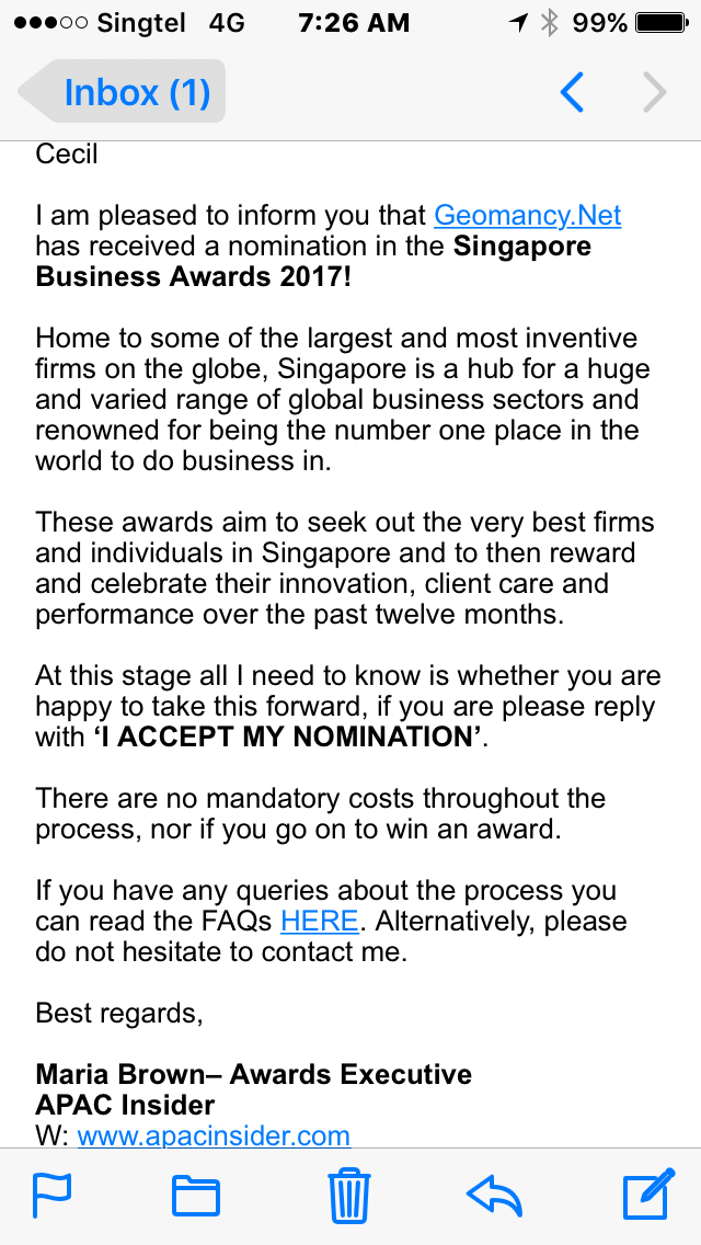 1 pointIn my opinion, most likely from a page from the traditional Nigerian Con Book 101? ?Most likely later on you may have to pay for your own Award. If awards are that so easy to give......? "Most likely money ? falls from the tree ? for them.. not Us"1 point - Holland Condominium by Capitaland & UOL Group