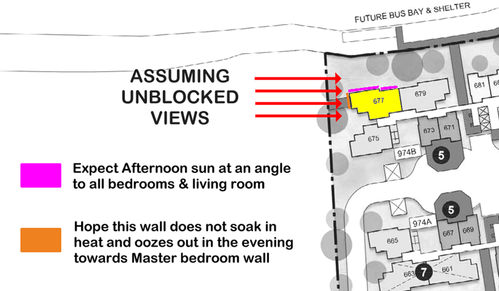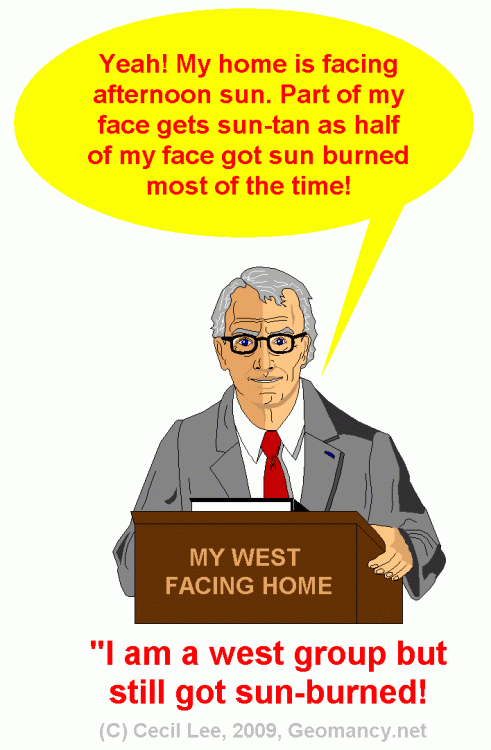 [1.] The afternoon sun can influence moods within a home. The afternoon sun can influence the ambiance of a home, and heat is known to have a significant impact on our mood. [1.1.] Older HDB flats often have distinctive characteristics, such as unit windows with shades that face the afternoon sun. Reference: +++ [1.2.]Identifying the afternoon sun rays on a single sample: Unit #677. While Unit #677 doesn't receive direct afternoon sunlight, on sunny days, expect sunlight at an acute angle throughout the year. Don't be too relieved if the living room area isn't affected by the afternoon sun rays; the situation may change in six months. +++ Site Plan Extract for HDB BTO Tampines GreenTopaz +++ Macro Site Plan of HDB BTO Tampines GreenTopaz +++ [1.3.] Many second-time homebuyers often try to avoid purchasing homes that receive the "afternoon sun," even if they belong to the West Group. Is this accurate? 1. Indeed, those who have previously lived in a west-facing home and are aware of the challenges often seek to avoid repeating the experience, especially when considering a long-term stay of five years or more. 2. It's common sense that on a sunny day, from the afternoon until the evening, the walls, having absorbed heat, can radiate it back into the home, making it uncomfortably warm even as late as 7:30 pm. Not everyone can afford to run the air conditioning throughout the evening. 3. Nowadays, many school children attend classes in the morning and return home by noon, while adults may spend their day in air-conditioned offices. The children are left to endure a hot and sweaty environment at home, which is hardly conducive to studying, especially when the air conditioning cannot be used all day due to the high cost of electricity for many families. 4. This can also impact the resale value. Many young homeowners, during their first resale home viewing, have encountered owners who turn on the air conditioning to conceal the heat. Consequently, these young couples experience a rude awakening upon receiving the keys to their new home, finding themselves in a residence akin to a sweltering greenhouse. 5. Perhaps individuals in the West Group could consider evaluating the suitability of homes facing northeast, among other orientations. 6. It's also wise to consider the effects of UV rays on a person. The good news for Chinese individuals is the presence of "yellow skin pigments," while Malays and Indians have brownish skin tones. Darker skin is known to offer better protection against skin cancer. However, prolonged exposure to UV rays, such as from the afternoon sun, can lead to long-term effects on our eyes, like cataracts, which may become more pronounced with age if one is frequently exposed. Reference: [1.4.]. Related: Any concern with the afternoon sun? Afternoon sun and ME! - Caricatures: Laughter is good medicine & more... - FengShui.Geomancy.Net +++ [1.5.] Moods and feelings are often categorized under the concept of 'Man or Human Luck.' What is Man or Human Luck?1 point- Good day to start work on Chinese New Year (CNY) 2025? When you open? What is 2025's Wood Snake Forecast like?