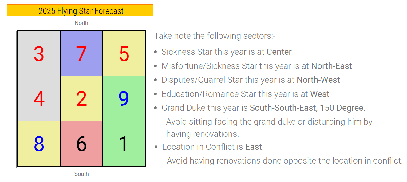Snake - 2025 Chinese Horoscope & Feng Shui Yearly Forecast 2025 Chinese Horoscope & Feng Shui Yearly Forecast Snake Year - 29 Jan 2025 to 16 Feb 2026 This analysis is done by Geomancy.Net using a combination of Chinese Astrology/Horoscope (Zi Wei Dou Shu) with Ba Zi Analysis. EXPLANATION NOTE This is done using only 12 Earthly Branch / Animal Signs and Ba Zi Element. This forecast will analyse the 10 divisions of each Horoscope Sign (ie. weak/strong water Rat, weak/strong Wood Rat, weak/strong Fire Rat, weak/strong Earth Rat, weak/strong Metal etc). So depending on what kind of element you are, your luck will change accordingly. As this is a general forecast, individual combinations and clashes are NOT considered. For more detailed and accurate analysis, you should refer to your own personalised ba zi premium forecast report. However, this forecast will generally be better than most basic forecast that only analyses based on 12 Horoscope Signs. Fire Snake in Wood Year 2025 Forecast 2025 Year Pillar Details Heavenly Stem yi yin Wood Ten Deities bi jian Friend Earthly Branch si yin Fire Hidden Element 1 bing yang Fire Ten Deities 1 shang guan Intelligence Hidden Element 2 wu yang Earth Ten Deities 2 zheng cai Earned Wealth Hidden Element 3 geng yang Metal Ten Deities 3 zheng guan Authority Heaven & Earth Element Fire 2025 General Summary Fire Snake in a Wood Year. As the Wood Year strengthen the Fire Snake, this is generally a very auspicious year. Birth Element which will enjoy a favourable/unfavourable year etc. Strong Water, weak Wood, weak Fire weak Water, Strong Fire, weak Earth Compatible Animal Signs this year:- Excellent - Rooster, Ox Avoid - Tiger, Snake, Pig Good Travel Direction this year:- Water - North Wood - East/South-East 2025 Flying Star Forecast North 3 7 5 4 2 9 8 6 1 South Take note the following sectors:- Sickness Star this year is at Center Misfortune/Sickness Star this year is at North-East Disputes/Quarrel Star this year is at North-West Education/Romance Star this year is at West Grand Duke this year is South-South-East, 150 Degree. - Avoid sitting facing the grand duke or disturbing him by having renovations. Location in Conflict is East. - Avoid having renovations done opposite the location in conflict. 2025 Monthly Forecast NOTE: Monthly Forecast is based on Chinese Lunar Month 1st Month 2nd Month 3rd Month 4th Month Bad Average Average Bad 5th Month 6th Month 7th Month 8th Month Average Average Average Good 9th Month 10th Month 11th Month 12th Month Average Bad Average Average 12 Horoscope Signs Summary Yearly Horoscope Forecast for 2025 Rat Average Ox Average Tiger Bad Rabbit Average Dragon Average Snake Bad Horse Average Ram Average Monkey Average Rooster Good Dog Average Pig Bad More Detailed Ba Zi Element Forecast of each Horoscope Sign Horoscope Rat Average Metal Rat Water Rat Wood Rat Fire Rat Earth Rat Weak Metal Worst Weak Water Bad Weak Wood Good Weak Fire Best Weak Earth Worst Strong Metal Best Strong Water Good Strong Wood Bad Strong Fire Worst Strong Earth Good Ox Average Metal Ox Water Ox Wood Ox Fire Ox Earth Ox Weak Metal Worst Weak Water Bad Weak Wood Good Weak Fire Best Weak Earth Worst Strong Metal Best Strong Water Good Strong Wood Bad Strong Fire Worst Strong Earth Good Tiger Bad Metal Tiger Water Tiger Wood Tiger Fire Tiger Earth Tiger Weak Metal Worst Weak Water Bad Weak Wood Avg Weak Fire Good Weak Earth Worst Strong Metal Good Strong Water Avg Strong Wood Bad Strong Fire Worst Strong Earth Avg Rabbit Average Metal Rabbit Water Rabbit Wood Rabbit Fire Rabbit Earth Rabbit Weak Metal Worst Weak Water Bad Weak Wood Good Weak Fire Best Weak Earth Worst Strong Metal Best Strong Water Good Strong Wood Bad Strong Fire Worst Strong Earth Good Dragon Average Metal Dragon Water Dragon Wood Dragon Fire Dragon Earth Dragon Weak Metal Worst Weak Water Bad Weak Wood Good Weak Fire Best Weak Earth Worst Strong Metal Best Strong Water Good Strong Wood Bad Strong Fire Worst Strong Earth Good Snake Bad Metal Snake Water Snake Wood Snake Fire Snake Earth Snake Weak Metal Worst Weak Water Bad Weak Wood Avg Weak Fire Good Weak Earth Worst Strong Metal Good Strong Water Avg Strong Wood Bad Strong Fire Worst Strong Earth Avg Horse Average Metal Horse Water Horse Wood Horse Fire Horse Earth Horse Weak Metal Worst Weak Water Bad Weak Wood Good Weak Fire Best Weak Earth Worst Strong Metal Best Strong Water Good Strong Wood Bad Strong Fire Worst Strong Earth Good Ram Average Metal Ram Water Ram Wood Ram Fire Ram Earth Ram Weak Metal Worst Weak Water Bad Weak Wood Good Weak Fire Best Weak Earth Worst Strong Metal Best Strong Water Good Strong Wood Bad Strong Fire Worst Strong Earth Good Monkey Average Metal Monkey Water Monkey Wood Monkey Fire Monkey Earth Monkey Weak Metal Worst Weak Water Bad Weak Wood Good Weak Fire Best Weak Earth Worst Strong Metal Best Strong Water Good Strong Wood Bad Strong Fire Worst Strong Earth Good Rooster Good Metal Rooster Water Rooster Wood Rooster Fire Rooster Earth Rooster Weak Metal Bad Weak Water Avg Weak Wood Good Weak Fire Best Weak Earth Bad Strong Metal Best Strong Water Good Strong Wood Avg Strong Fire Bad Strong Earth Good Dog Average Metal Dog Water Dog Wood Dog Fire Dog Earth Dog Weak Metal Worst Weak Water Bad Weak Wood Good Weak Fire Best Weak Earth Worst Strong Metal Best Strong Water Good Strong Wood Bad Strong Fire Worst Strong Earth Good Pig Bad Metal Pig Water Pig Wood Pig Fire Pig Earth Pig Weak Metal Worst Weak Water Bad Weak Wood Avg Weak Fire Good Weak Earth Worst Strong Metal Good Strong Water Avg Strong Wood Bad Strong Fire Worst Strong Earth Avg Explanation 1) To fully utilise this forecast, you must determine your True Ba Zi element. Click Here. 2) Each horoscope will have a general forecast. Such as all Rat horoscope generally can either be Good or Average or Bad. 3) Each of us is considered either "weak" or "strong" and belong to either one of the following elements: Metal, Water, Wood, Fire or Earth. This