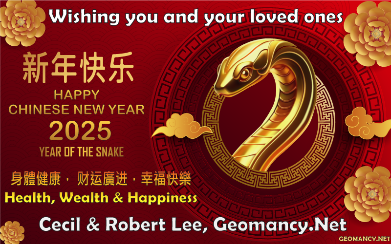 The Year of the Wood Snake "The Wood Snake in 2025 will bring about growth, resilience, and a pioneering spirit, ushering in a time of innovation, technology, and originality. It will be essential to maintain a positive attitude in the Year of the Wood Snake in order to achieve success in life during this time." * Master Cecil Lee, Geomancy.net * When to open for business or start work? On any of these days:- Thursday, 30th January (2nd Lunar day) Saturday, 1st February (4th Lunar day) Monday, 3rd February (6th Lunar day) Wednesday, 5th February (8th Lunar day) or Friday, 7th February (10th Lunar day) +++ Geomancy.net close on 28th January at 12pm GMT+0800 and Opens for business from/on 30th January 2025. +++ Any timing to start work?1 point