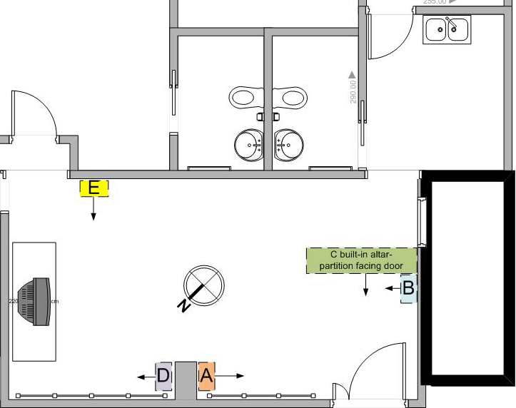 Thanks for your advice, Mr Cecil. Between the two best positions recommended, we feel that B is the better of the two. However, position B is right in between 2 doorways (if including the service balcony beyond the kitchen, that makes 3). The path is very windy all the time, no matter how small the main door opening is. We are totally clueless as to how to keep flames (candles/"you deng") lighted in this path. Challenge 1: How can we remedy this? Is there a design for altar that 'blocks' the wind or should we get something to shield the candles or "you deng" and the spiral incense? Challenge 2: Due to the space constraints, may we place chairs against the same wall. Must we keep the wall clear of things? We were thinking of building a rackfor shoes and going-out stuff, behind the door on the same wall. Challenge 3: If we want to invite the 'Sky' and 'Earth' gods in too, will we be able to use the same position for 'Earth god'? Thanks!