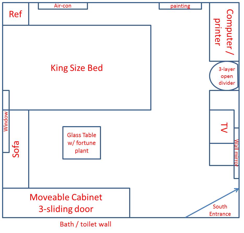 Dear Mr. Cecil, Thank you very much for your great advise, this will help me a lot. I just want to clarify the following: 1. If I will keep my original layout andjust swap the place of TV and Cabinet, is it okay also toexchange thecomputer/printer with the new location of TV? 2. Also, I just noticed last night that 1/8 part of mybed is overlapping with the window, is this would be a problem or is it okay to retain the location of the bed. I am currently living in Riyadh with my husband and daughter. Here in Riyadh nobody opens their window due to too much dust orthey call it sandstorm. We usually even put heavy duty tape to cover the whole window to avoid single dust entering inside the house/room. 3. For the a/c we always keep theshutter upwards so it will blowdirectly inceiling. Looking forward to hear yourhelpful advise. Thank you, Ana
