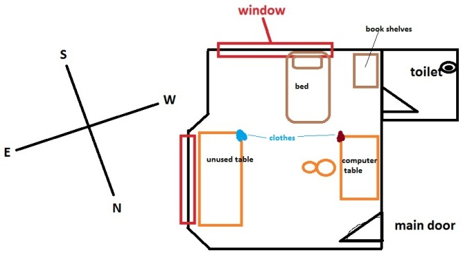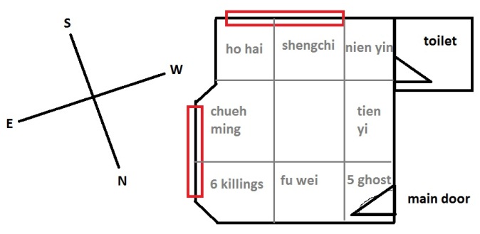 i want to ask where is best place to put my bed and computer.(basicaly the 2 main things in my room) Here is the layout:- [IMG]http://i40.photobucket.com/albums/e227/woopypooky/a.png[/IMG] And based on my personal kua number of 8, i have divided the room into these section. Not sure whether they are correct or not as my room arent parallel with any NSEW oreintation:- [IMG]http://i40.photobucket.com/albums/e227/woopypooky/b.jpg[/IMG] And here is what i doing right now. [IMG]http://i40.photobucket.com/albums/e227/woopypooky/c.jpg[/IMG] The other day, i saw 2 edges of the tables pointing at my bed, so i put clothes at the edge there. What do master think?