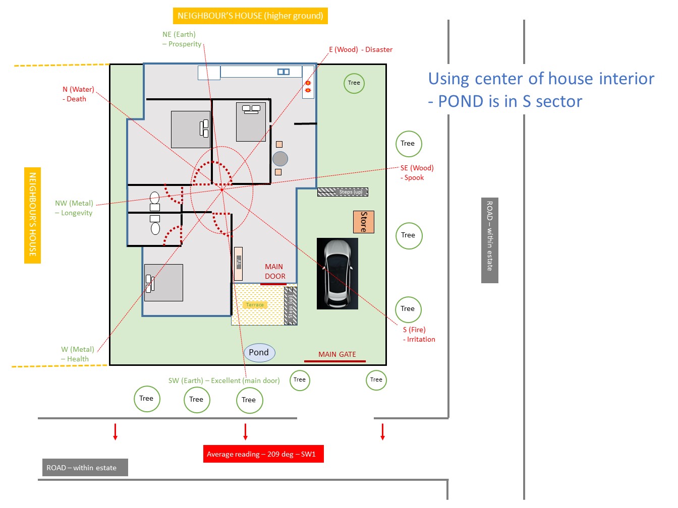 I think I should re-phrase my question. I am puzzled specifically what sector the pond should belong to. SW or S? Attached the drawing to illustrate. Thank you.