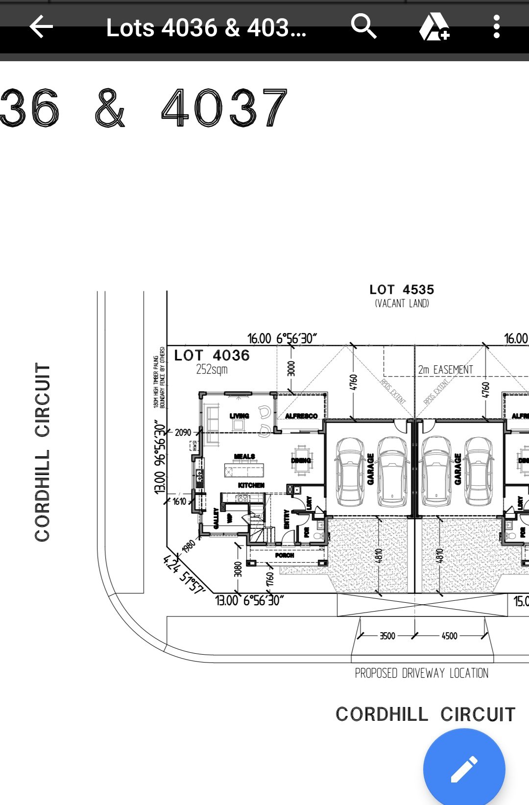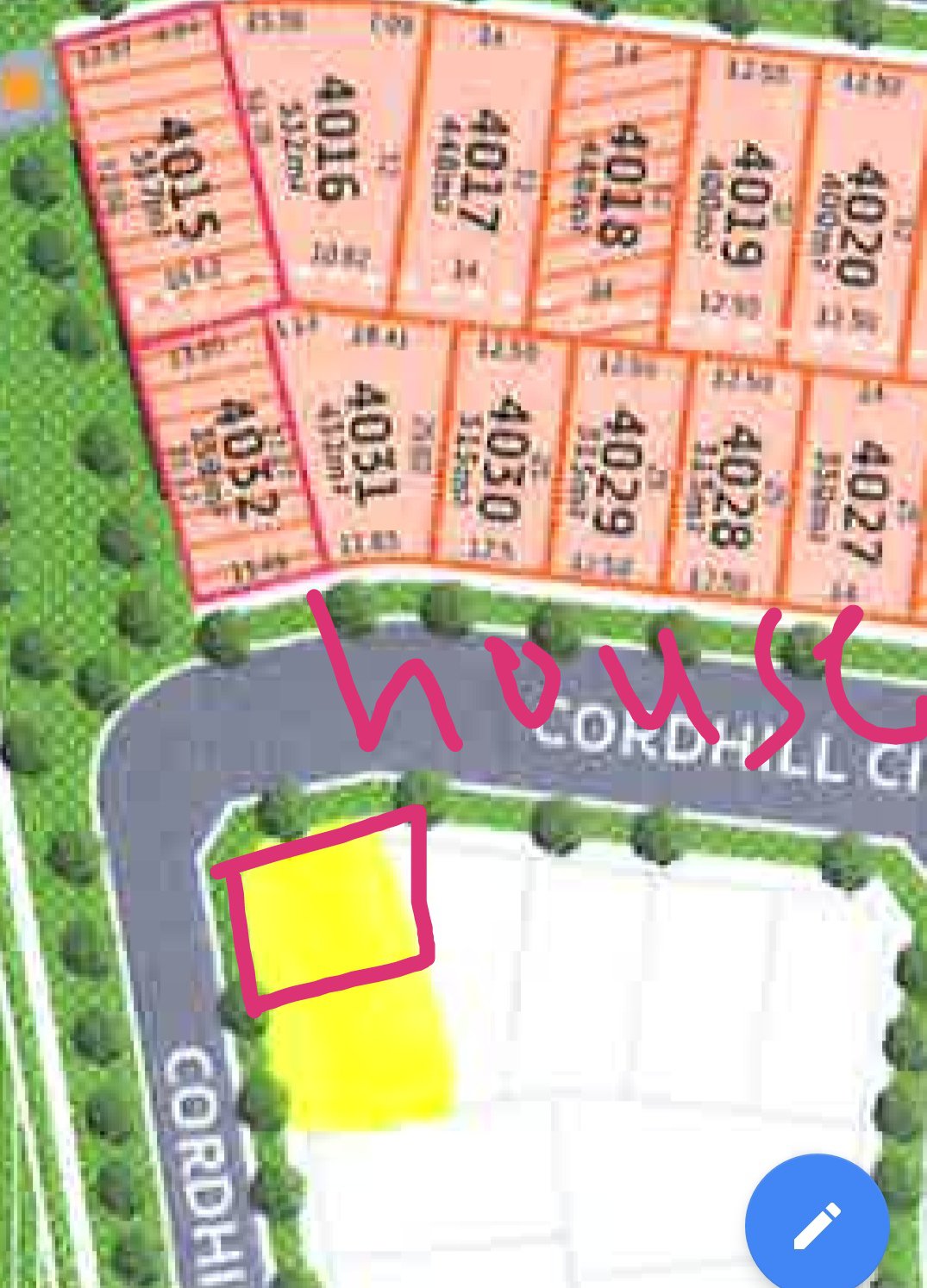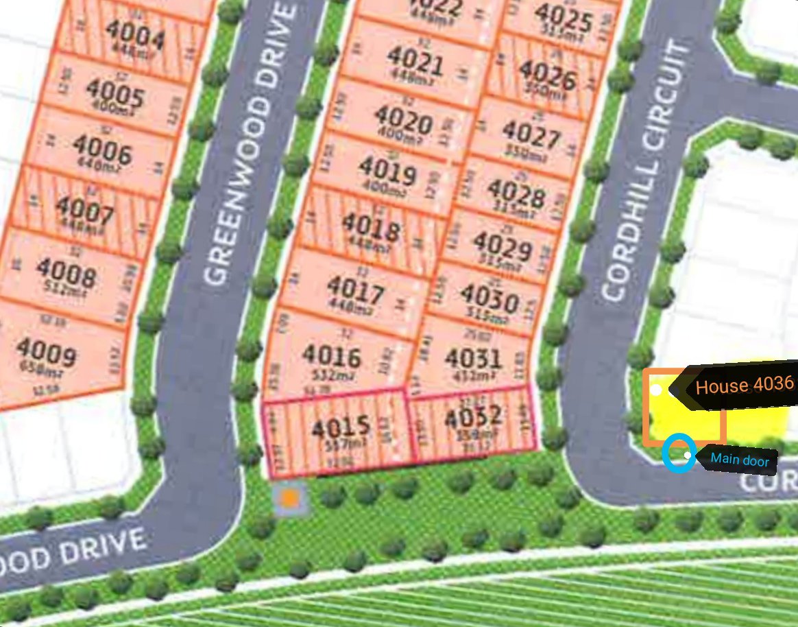 1. Where is the main door facing. For example facing 4032 or ? -main door facing south and facing grasses. Behind the lot 4036 is a house. East will be facing road and west will be a house. Frontage will be grasses. I hope the photos I sent now is OK. Thank you