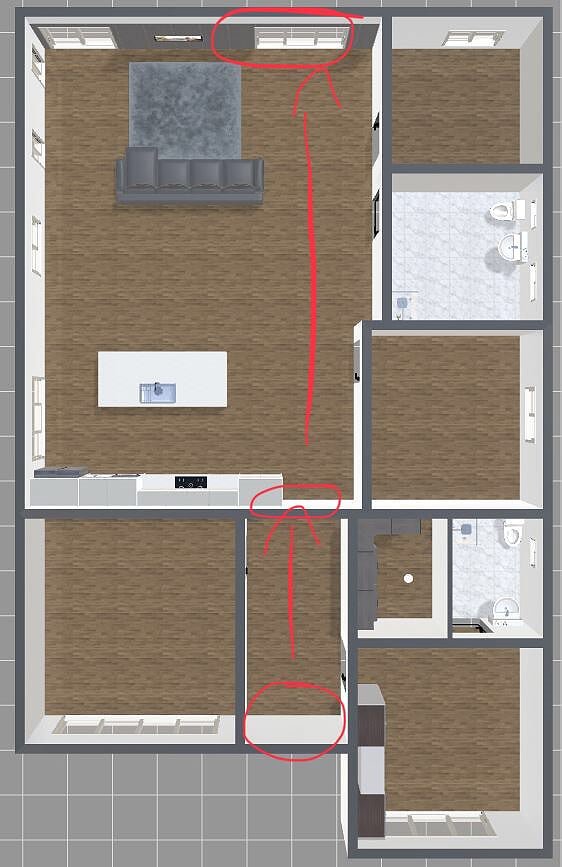 My house has three doors in a straight line. The first door is the main door and is the biggest door. The 2nd door is the middle door and opening to the open concept kitchen, dinning and living room. The 3rd door is the sliding door and opening to our big backyard. I attached our floor plan below.