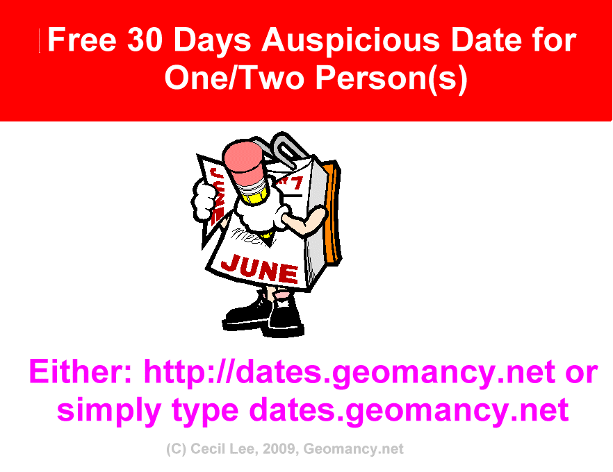 Posted April 9, 200916 yr Staff You can always check the next 30 days auspicious dates for one or two persons under this url:- http://dates.geomancy.net or simply type: dates.geomancy.net