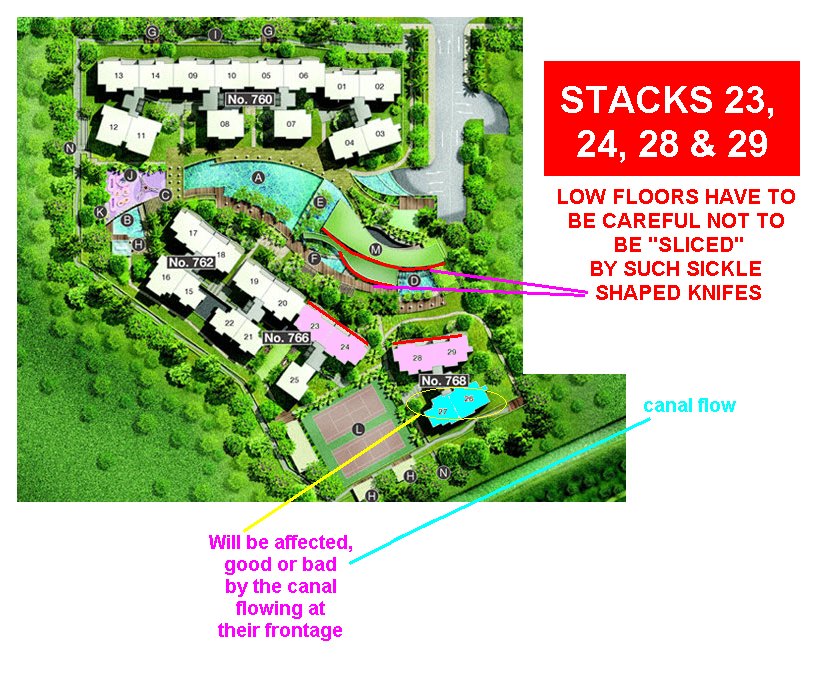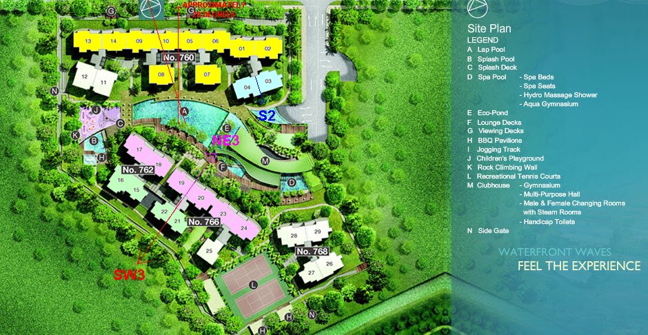 Posted July 10, 200916 yr Staff 1. Waterfront waves is a new uncompleted development located at 760 to 782 Bedok Reservoir Road. 2. The estimated completion date is two years away in 2011. 3. This development belongs to Period 8:- 3.1 Excellent units especially for East Group persons are stacks: 03 and 04 (light blue) 3.2 In general, stacks 17 to 24 (in pink) has good qi frontage of approximately 60 degrees or NE3 facing direction. And correspondingly, stacks 15, 16 and 21, 22and 25 have stacks facing SW3. Equally good facing directions especially for the West Group. (Other than the consideration of the dreaded afternoon sun). 4. Stacks 01, 02, 05, 06, 07, 08, 09, 10, 13 and 14 (bright yellow) hopefully remain as a North 3 facing direction. As the compass direction seems to "hover" around 20 degrees. Which is very close for comfort to the line of emptiness ie. 22.5 degrees. Again, hopefully, these units do not fall exactly at 22.5 degrees as the term "emptiness" suggests. Proper compass reading should be taken once the development has TOP - and lets cross our fingers for those who buy these units. Other development information: Tenure: 99 years consisting of 405 units. It's developer is Frasers Centrepoint Limited with Far East Organisation.Facilities include: LAP POOLSPLASH POOLSPA POOLSPA BEDSSPA SEATSHYDRO MASSAGE SHOWERAQUA GYMSUN DECKECO-PONDLOUNGE DECKSVIEWING DECKSBBQJOGGING TRACKCHILDREN'S PLAYGROUNDROCK CLIMBING WALL2 TENNIS COURTSCLUBHOUSEGYMMULTI-PURPOSE HALLCHANGING ROOMS WITH STEAM ROOMSHANDICAP TOILETS