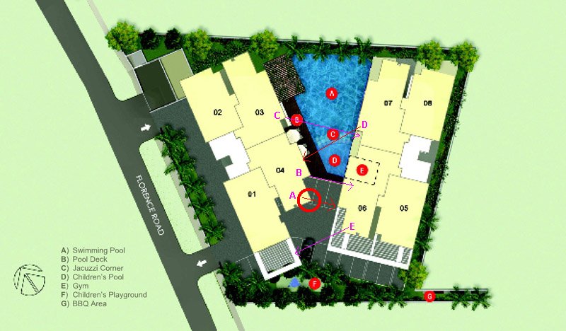 Posted July 10, 200916 yr Staff This is a tiny condo development with a total of 34 units. Tenure left is 947 years to go. Estimated completion date is in mid 2011. It's a very uncommon "V" shaped layout plan. Flying star is a Period8 development.The main block with stacks 06& 07 facing NW. While stacks 08& 09 facing SE. And a smaller block with stacks 01 & 02 West 2 facing. And stacks 3 & 4 East 2 facing. I brought out this site as another example where we have to be careful of the "porcupines" i.e. sharp corners aimed at the individual units. Please refer to attachment: In this example, the most distinct poison arrow is the purple marking "D" where the sharp corner of stack 07 creates a poison arrow towards stack 04 thru the living room balcony area. There is another poison arrow in the purple marking "B". Where stack 04's corner is aimed towards stack 06's living room area. Happy to note that the rest of the markings "A, C, D & E" don't seem to pose an issue as these are psuedo poison arrows that don't attack any stack or stack openings. Although marking C may or may not attack stack 07 which has to be closed evaluated on-site. Facilities Swimming Pool, Jacuzzi, Playground, Gymnasium, BBQ, Basement Parking