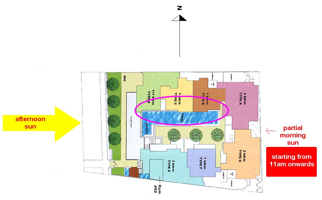 Posted July 10, 200916 yr Staff 1. Please note that I have used the site plan of Mackenzie 138 BUT changed the compass direction to illustrate the effects of continous evaporation of water from the swimming pool may affect residents particularly the very young - with respiratory problems. 2. In this EXAMPLE or ILLUSTRATION, notice the following:- 2.1. the entire block consists of a "U" shaped layout plan - where all the stacks are "joined" closely together. 2.2. Fortunately, the compass direction is just for illustration - not real. But it shows that depending on the height of the entire block, surely at least morning sun would shine on the swimming pool at least starting from 11am and on a sunny day, it will built up until 5 plus pm. 2.3 You will notice that the the length (or the longest side) of the swimming pool is aligned East to West. 3. Unit Types D, C & E are just directly above the swimming pool. And on days with very high evaporation of the "chemical water" in the pool, and assuming that not everyone opens their windows, some units on either side may be exposed to much more moisture from the constant evaporation from the swimming pool. 4. Here, especially those with very young or new born may be exposed to higher concentrations of such "moisture" especially if they are at lower floors; depending on the wind conditions and how wide they open their windows. And if other neighours don't open their windows - can be another factor. 5. Fortunately, on the next thread, will attach the actual layout plan with its actual compass markings. Here, the exposure of the swimming pool to direct sunlight is much lesser as the swimming pool no longer aligns itself with the east and west compass line.