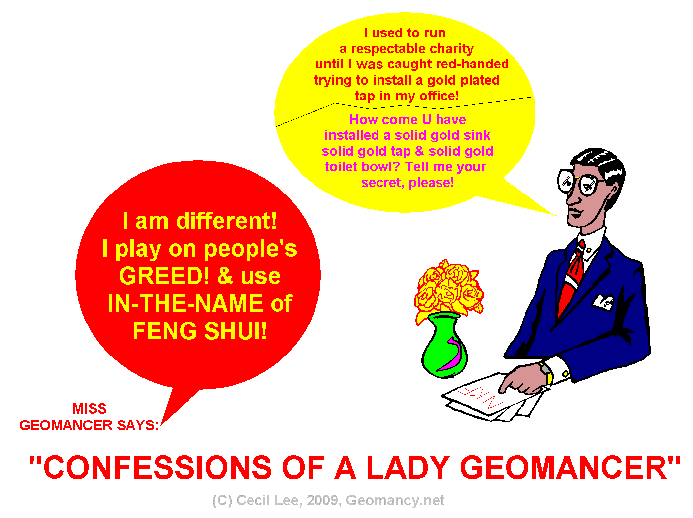Posted August 29, 200916 yr Staff The Confessions of a Lady Geomancer...1. When the buying STOPS! The selling CAN! 2. When a CEO of a famous charity wanted to install a gold tap in his office - bathroom toilet; he got caught red-handed when he sued a news-paper.... 3. But when a Feng Shui Master sold in-the-name of Feng Shui products and use her spoils; to install solid gold sinks, taps, and toilet bowls.. no one can falter her, WHY? WHY? WHY?
