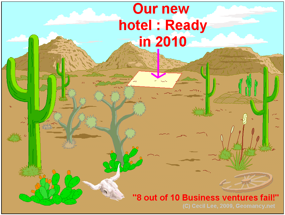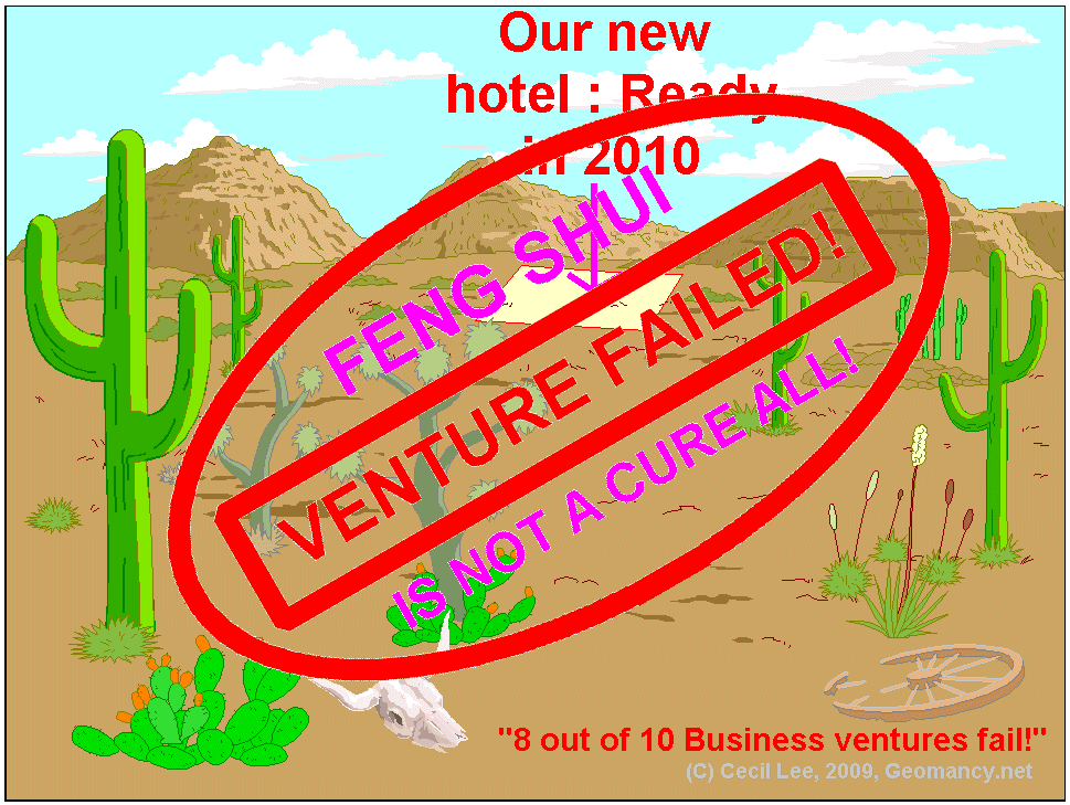 Posted September 3, 200916 yr Staff What more do you want? My academic Geomancer, has read and studied that sites where we can see the dragon embracing the tiger (in a gentle embrace) is considered some of the best lands around. Unfortunately, the Geomancer is not a practicing person. He is what you called a book worm type of non-hands on person. Not all business, can succeed! In fact in many instances 8 out of 10 business ventures fail within a year or two! Feng Shui is not a cure all! What? A hotel in the middle of a deserted desert! Are you mad?