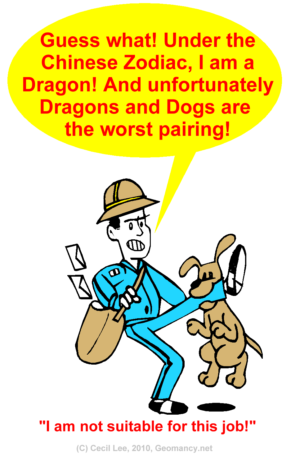 Posted April 14, 201015 yr Staff It is fated! As I was born in the year of the Dragon; I can't become a postman! As dogs really, really hate me!
