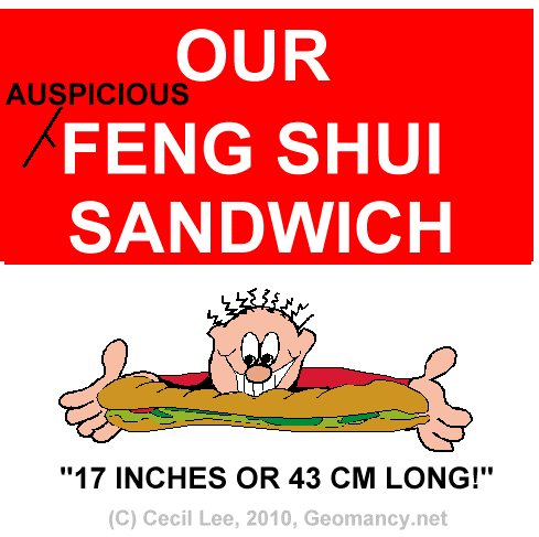 Posted March 12, 201015 yr Staff 1. In the 1980's there was the "Fast Food Feng Shui" craze.2. In the 2010's we now have the "everything" also in the "Name of Feng Shui" association. 3. Heard of the "Feng Shui Jewlry; the Feng Shui beads; the numerous Feng Shui commercial products? 4. This restaurant chain : " Sub-wave Sandwich " has come up with a new in the name of Feng Shui sandwich: the auspicious 17 inch or 43 cm length sandwich! (Note: every 17 inches = 1 Feng Shui foot) 5. An ardant fan of Jack Neo says: "He has conquered many; 11? If so, I want to beat both his and Tiger Wood's record! Fortunately, unlike the two of them; I don't have a wife! So no worries hurting such a partner!" Wow; give me one of those fantastic Jack Neo - Feng Shui drinks or both Jack Neo's Feng Shui and Tiger Woods cookies!