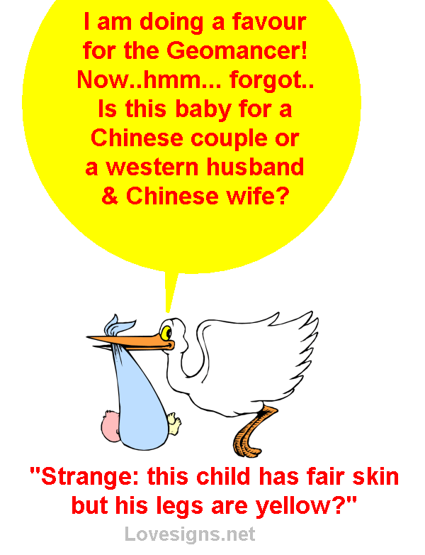 Posted July 20, 201015 yr Staff The stork did not pay attention to what the Geomancer told him. The stork is now confused? To whom should he deliver the baby to? The stork is confused as the baby has yellow skin on his legs and fair skin on his face and body..hmmm.....