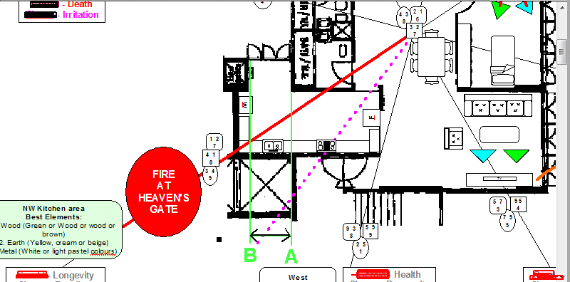 Posted September 7, 201015 yr Staff Please refer to the attached illustration:-1. In this sample illustration, the kitchen happens to be in the NW or Fire at Heaven's gate. 2. Thus, it is best that the stove is if possible, furthest from the true NW cardinal point. No matter how, for practical reasons, the stove no matter how, would still be somewhere in this kitchen. And again for practical reasons, the sink should not be extremely far away.3. In this attachment, the sink and stove are on the same kitchen cabinet. Thus, of course it is nice to have the sink and stove separated but often, if the kitchen allows; preferred that the sink is 43 cm or 17inches or more away from the stove.3.1 If really no choice then the stove may/could/ no choice be as little as 6 inches or more. (Of course or MORE is better).3.2 I am not going to deal with the Fire at Heaven's gate in this sample illustration nor how far it should be away from the apple green markings of the range between the wordings "A" to "B". Quote On 9/7/2010 7:46:05 PM, Anonymous wrote:hi, would like to ask if itpossible if the kichen sink isbeside the stove?please helpme....thank you!