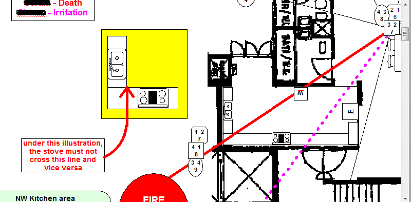 Posted September 7, 201015 yr Staff Please see attachement:-1. Please note that I purposely modified this file to show that the sink and stove is in a "L" shaped formation or turn.2. For this kitchen, where it is affected by the Fire at Heaven's gate; the Part I: layout plan or it's variant is preferred over this one.3. For this layout plan, I am not going to cover where the stove should be in relation to the "Open windows" at the service yard. (Shown under the Part I : in apple green range from markings "A" to "B".4. In this sample illustration, so long as the sink does not "protude" into the area of the stove or vice versa, is fine or OK! Quote On 9/7/2010 8:08:55 PM, Anonymous wrote:Please refer to the attachedillustration:-1. In this sampleillustration, the kitchen happens to bein the NW or Fire at Heaven's gate. 2.Thus, it is best that the stove is ifpossible, furthest from the true NWcardinal point. No matter how, forpractical reasons, the stove no matterhow, would still be somewhere in thiskitchen. And again for practicalreasons, the sink should not beextremely far away.3. In thisattachment, the sink and stove are onthe same kitchen cabinet. Thus, ofcourse it is nice to have the sink andstove separated but often, if thekitchen allows; preferred that the sinkis 43 cm or 17inches or more away fromthe stove.3.1 If really no choice thenthe stove may/could/ no choice be aslittle as 6 inches or more. (Of courseor MORE is better).3.2 I am not going todeal with the Fire at Heaven's gate inthis sample illustration nor how far itshould be away from the apple greenmarkings of the range between thewordings "A" to "B".On 9/7/2010 7:46:05PM, tes nepoy wrote:hi, would liketo ask if itpossible if the kichensink isbeside the stove?please helpme....thank you!