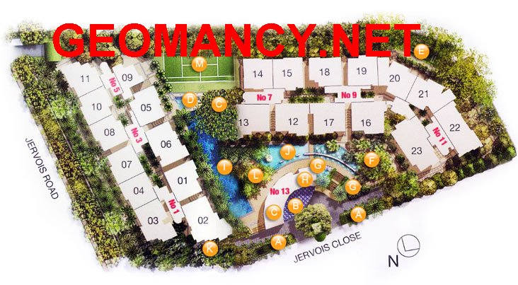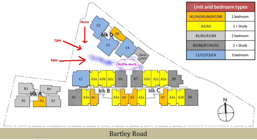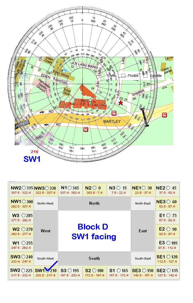 Note: Block D's facing for now seems to be 216 degrees. Hopefully, it is does not turn out to be exactly at 217.4. As 1.4 degrees off.. and falls under this very inauspicous alignment... How to tell? The only way is by going on-site to confirm the measurements. Often, this tolerance is safe - as in some developments, it is just 0.4 degrees.. Nevertheless..