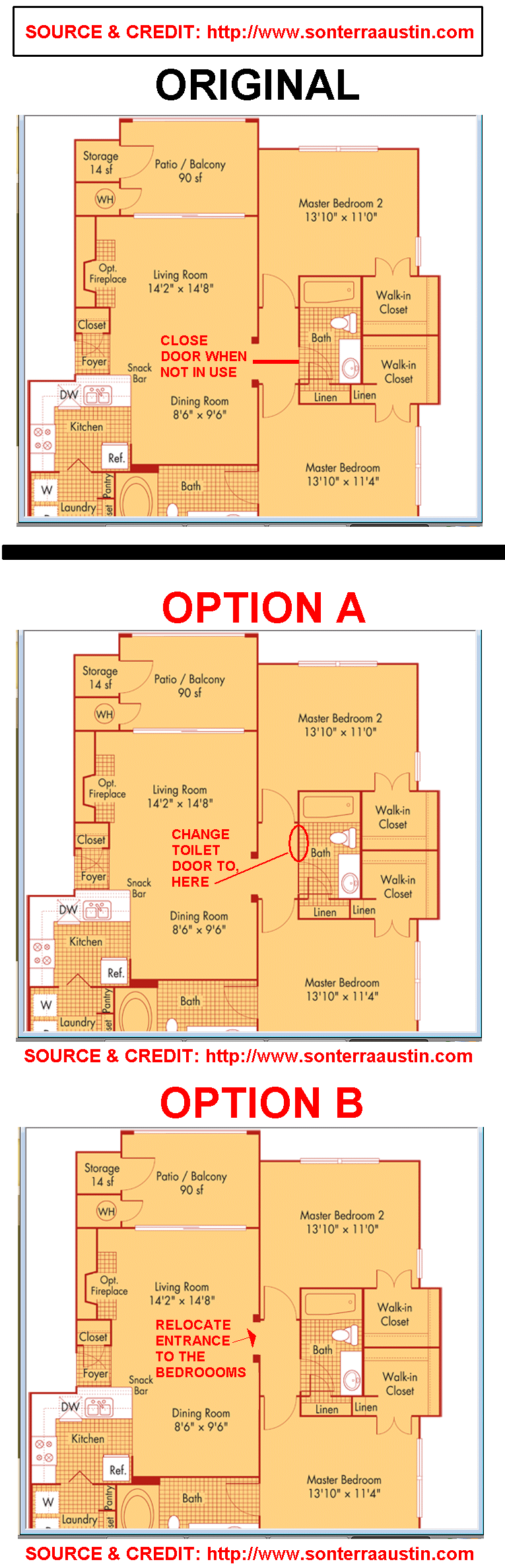 Posted May 30, 201114 yr Staff These are some considerations:1. Please refer to attachment.2. If based on the Original or existing layout plan; then close the toilet door when not in use.3. You can refer to Options A orB as possible viable alternatives. (Subject to structural engineering approval or your country's building approval on such alternation(s) ) Quote On 5/30/2011 11:01:27 PM, Anonymous wrote:Hi, The apartment that I'minterested has a bathroom withthe mirror in direct line withthe front door. The bathroomis also between the masterbedroom (with bath) and aguest bedroom. Can you tell meif this is bad feng shui. Ifso, is there a remedy for it?Below is the link to thefloorplan:http://www.sonterraaustin.com/floorplan2.asp?plan=B2IThanks,TT
