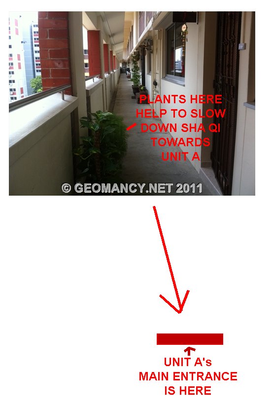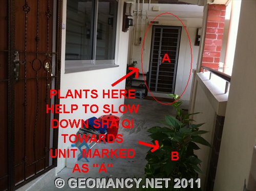 Posted October 6, 201114 yr Staff Unit marked in RED "A" faces a very long corridor.One plus point about the plants along marking in red "B" is that these plants help to slow down the sha qi towards Unit "A".Please see photo... Quote On 10/6/2011 8:28:11 PM, Anonymous wrote:These are more photos of this same unitmain entrance door...The strange thingis that if the main door WAS not tilted;the owner NEED not place a conVEX mirrorabove their main entrance door.Here, theowner tilted the main door that nowfaces the column.....On 10/6/20118:19:04 PM, Cecil Lee wrote:Today,while visiting aclient's apartment.Cameacross a HDB mansionette(Executive Flat) that had it'smain entrance door tilted.Onfurther observations;actually,it is far better notto tilt themain door. Asoriginally, the mainentrancefaces an "opening".Afterthisperson had tilted their maindoor; the main door faces thecolumn wall. This results as asha qi or poison arrow. Pleasesee photos...