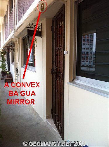 Posted October 6, 201114 yr Staff These are more photos of this same unit main entrance door...The strange thing is that if the main door WAS not tilted; the owner NEED not place a conVEX mirror above their main entrance door.Here, the owner tilted the main door that now faces the column..... Quote On 10/6/2011 8:19:04 PM, Anonymous wrote:Today, while visiting aclient's apartment. Cameacross a HDB mansionette(Executive Flat) that had it'smain entrance door tilted.Onfurther observations;actually, it is far better notto tilt the main door. Asoriginally, the main entrancefaces an "opening".After thisperson had tilted their maindoor; the main door faces thecolumn wall. This results as asha qi or poison arrow. Pleasesee photos...