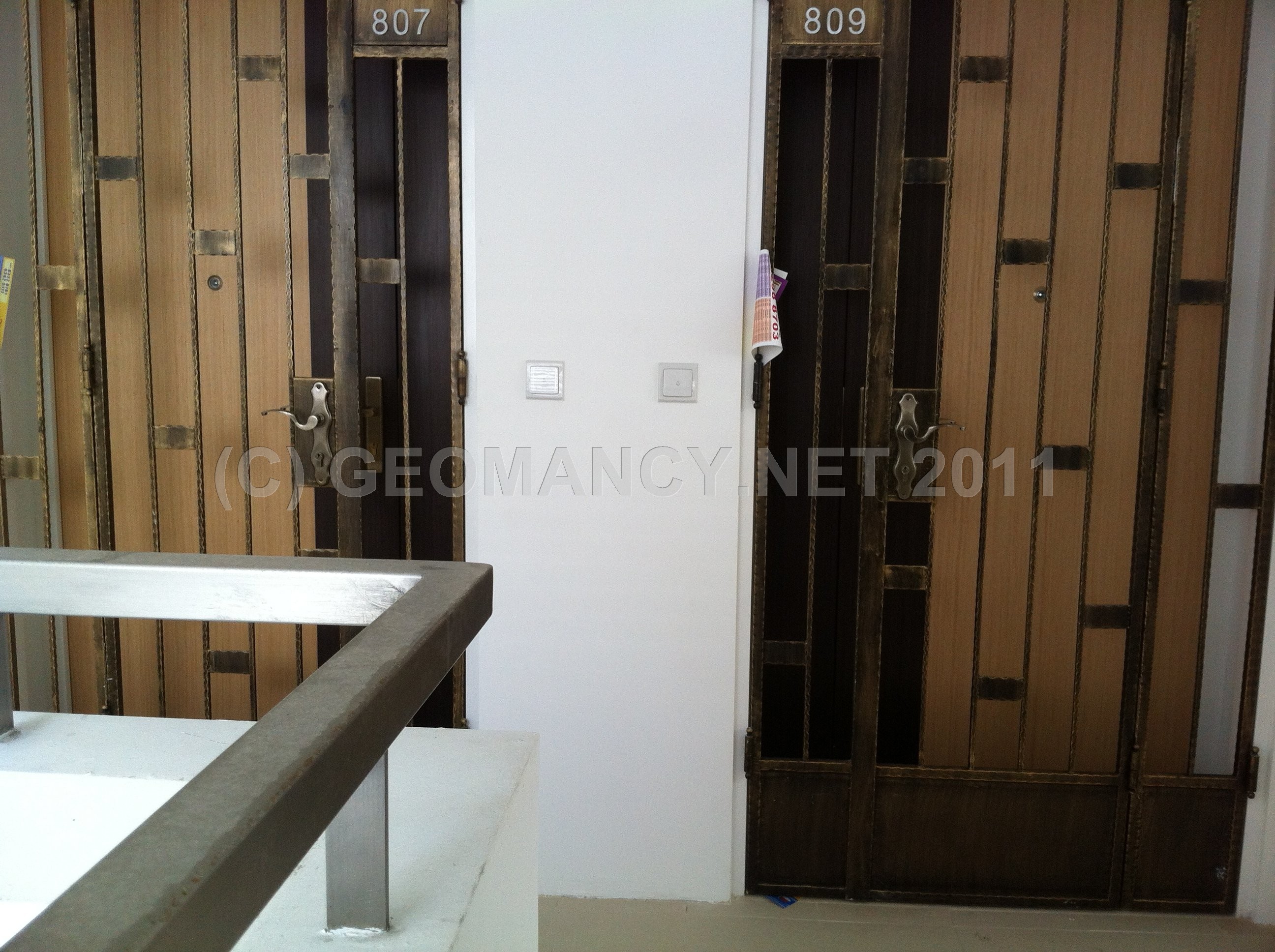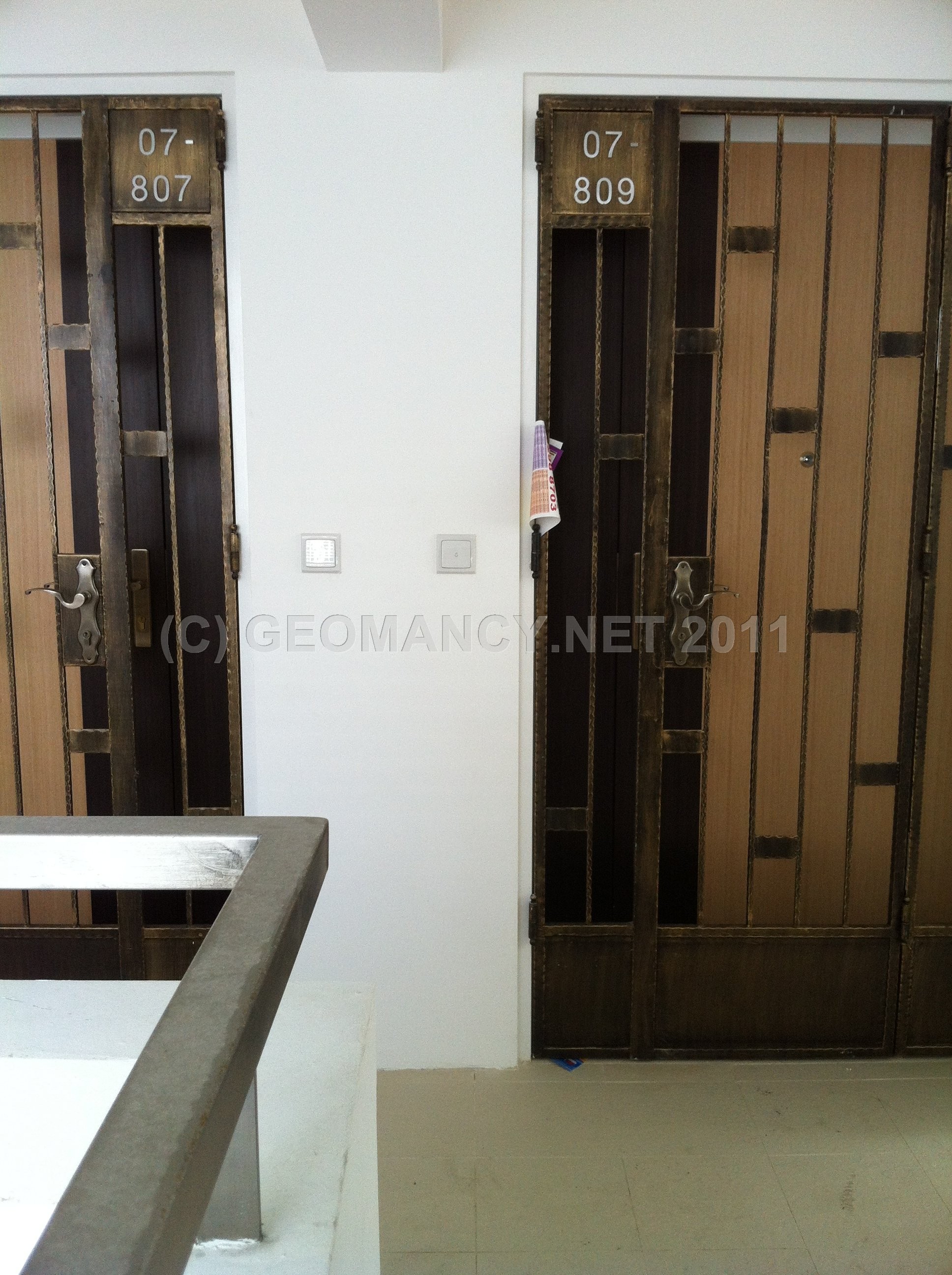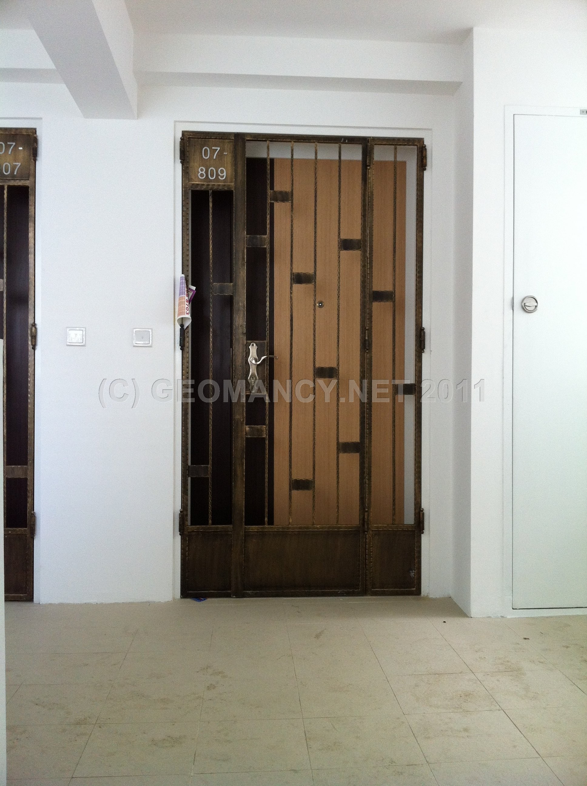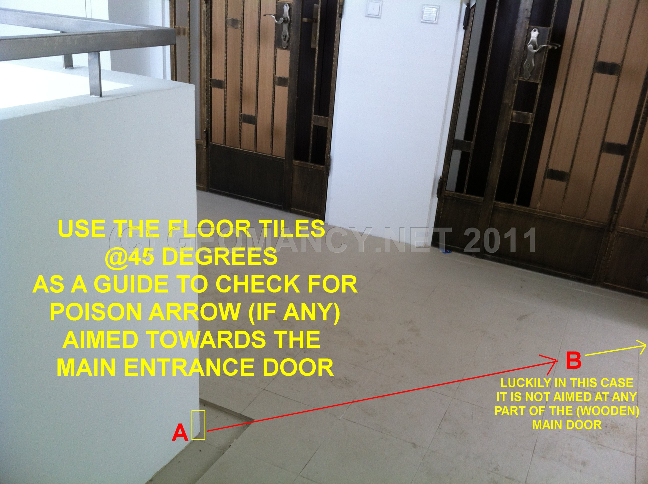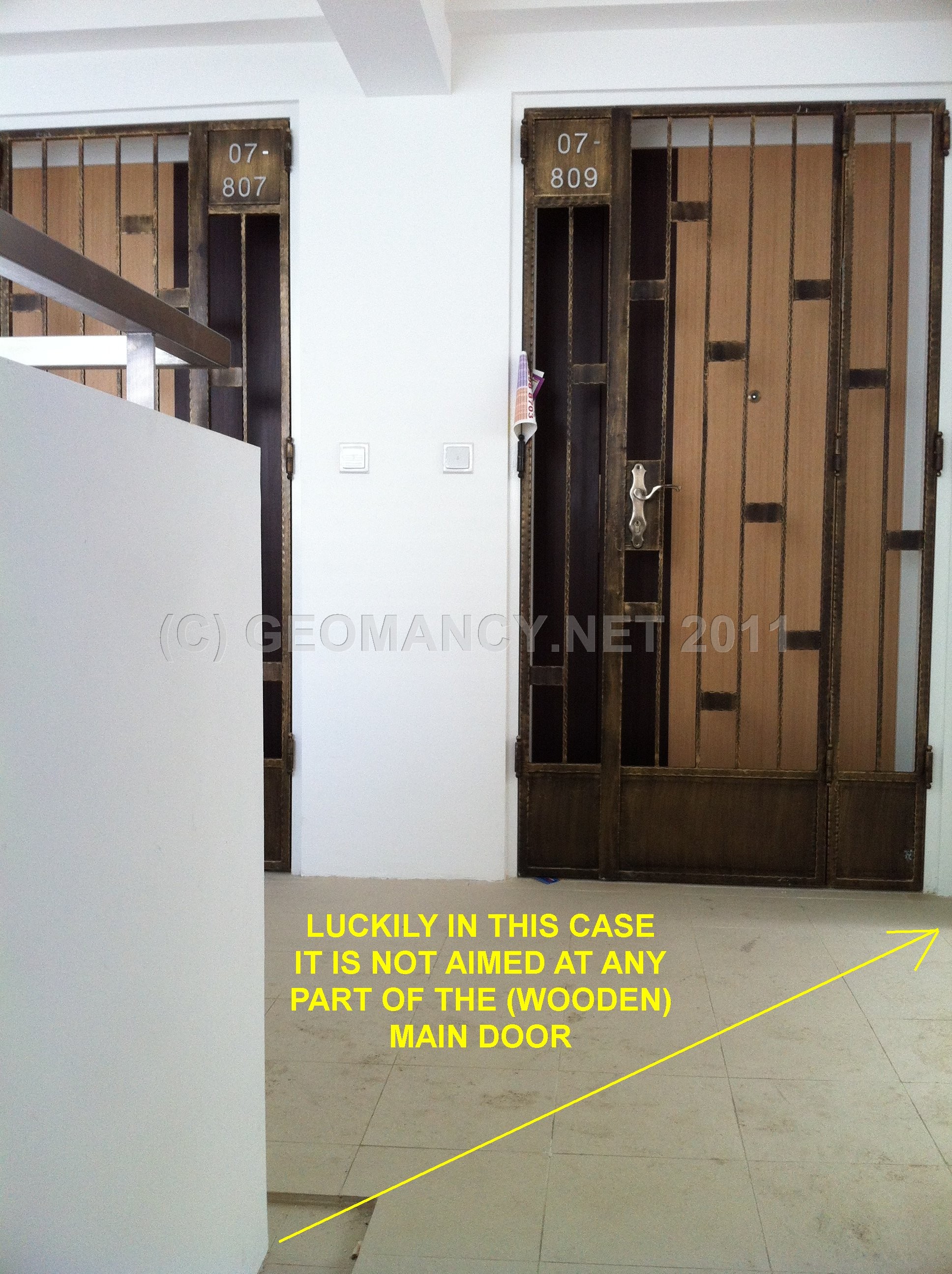 Posted October 22, 201114 yr Staff 1. Under Shapes and Forms Feng Shui; it is best that there is no Sha Qi (poison arrow[s]) aimed towards the main entrance door.2. In this illustration, just because it appears that there is a poison arrow of the 90 degree angle of a corridor wall; it does not necessarily mean that there is a poison arrow. Here, go and check it out!3. The best way is to LOOK AT THE FLOOR TILES andfollow the imaginary line at 45 degress angle and see if it lands anywhere close to the main entrance door or not?4. In this example; @ Blk 288A, Punggol Arcadia, fortunately, stack 809 is safe from the perceived "poison arrow". 5. If one follows the YELLOW line on two of the attached photos; the line does not cut into the main entrance door nor the grill gate.