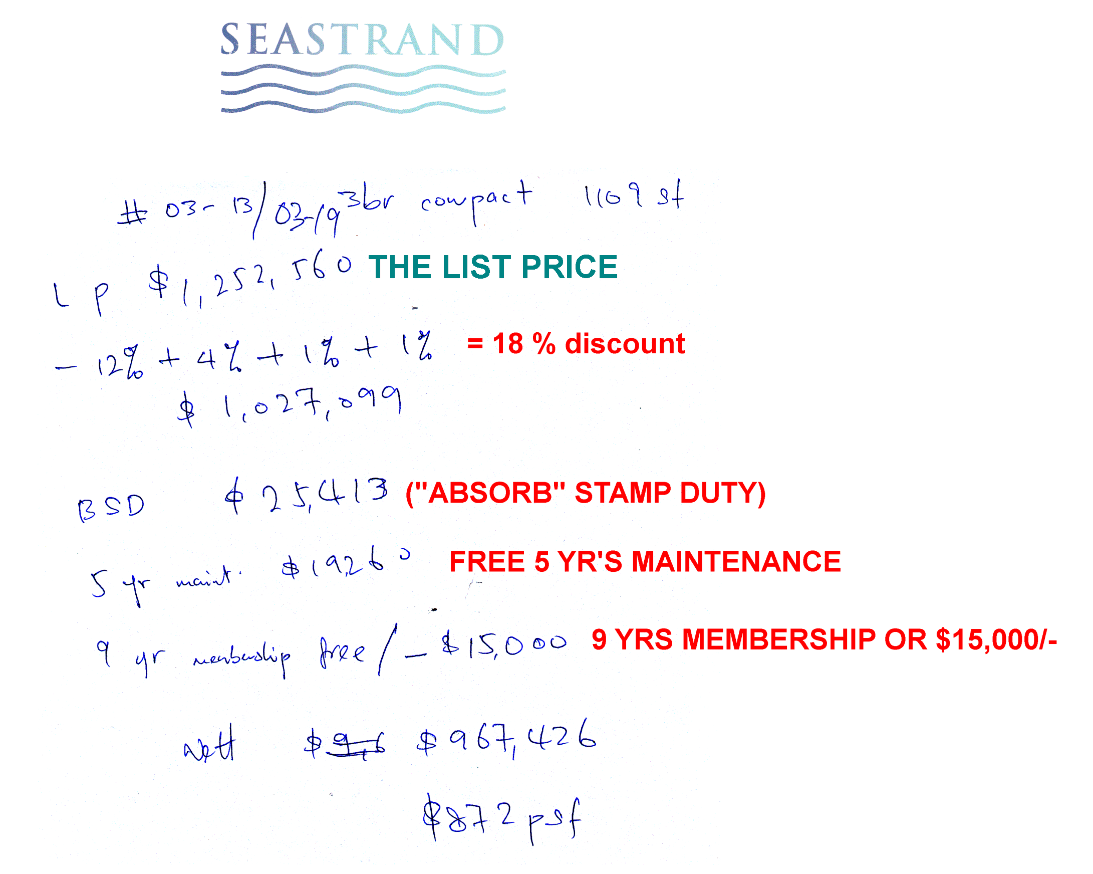 Posted September 14, 201213 yr Staff Facing both reduced field of buyers + competition from nearby (Watercolours - EC & Sea Esta)Supply exceeds demand..... It has been a long time since we hear of:-1. "absorb" stamp duty2. Pay upfront maintenance fees for the next 5 years3. Give 9 year's country club membership or accept$15,000.004. Some units also got "STAR BUY" DISCOUNT..Note: this quote was given sometime back; thus may not be valid anymore.... but I believe, for sure, prices are going to go down.. not up.....