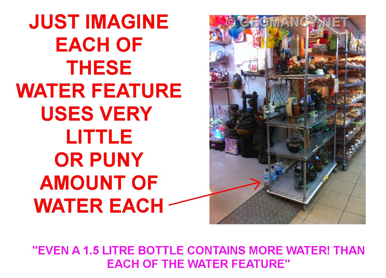 Posted September 18, 201213 yr Staff Further to whatI had written earlier:On the ground, behind the displays are empty water bottles. The owner of the shop uses such bottles to replenish water in each of their PUNY (tiny weany) water feature....A single small drinking bottle is sufficient to fill each of the water "feature".I believe, one should not consider each of the displays as a water feature. But rather a too small, too useless water position. Quote On 9/18/2012 7:13:02 PM, Anonymous wrote:1. Contrary to popular belief;activating such a waterfeature (see photos) isinsignificant.2. Perhaps, theonly thing that some may endup activating is theactivation by the bank tocancel one's already roll-overheavily indebted creditcards.. 3. Plus a call awayfrom the bank to make thatperson a bankrupt!4. Morale ofthe story: "Often, in the pastand even today, I visit a newclient and guess what... thispiece of "junk" is put away... or left forgotten... 5. Ashow many of us have the sillytime to always top up thewater for such a puny waterfeature?
