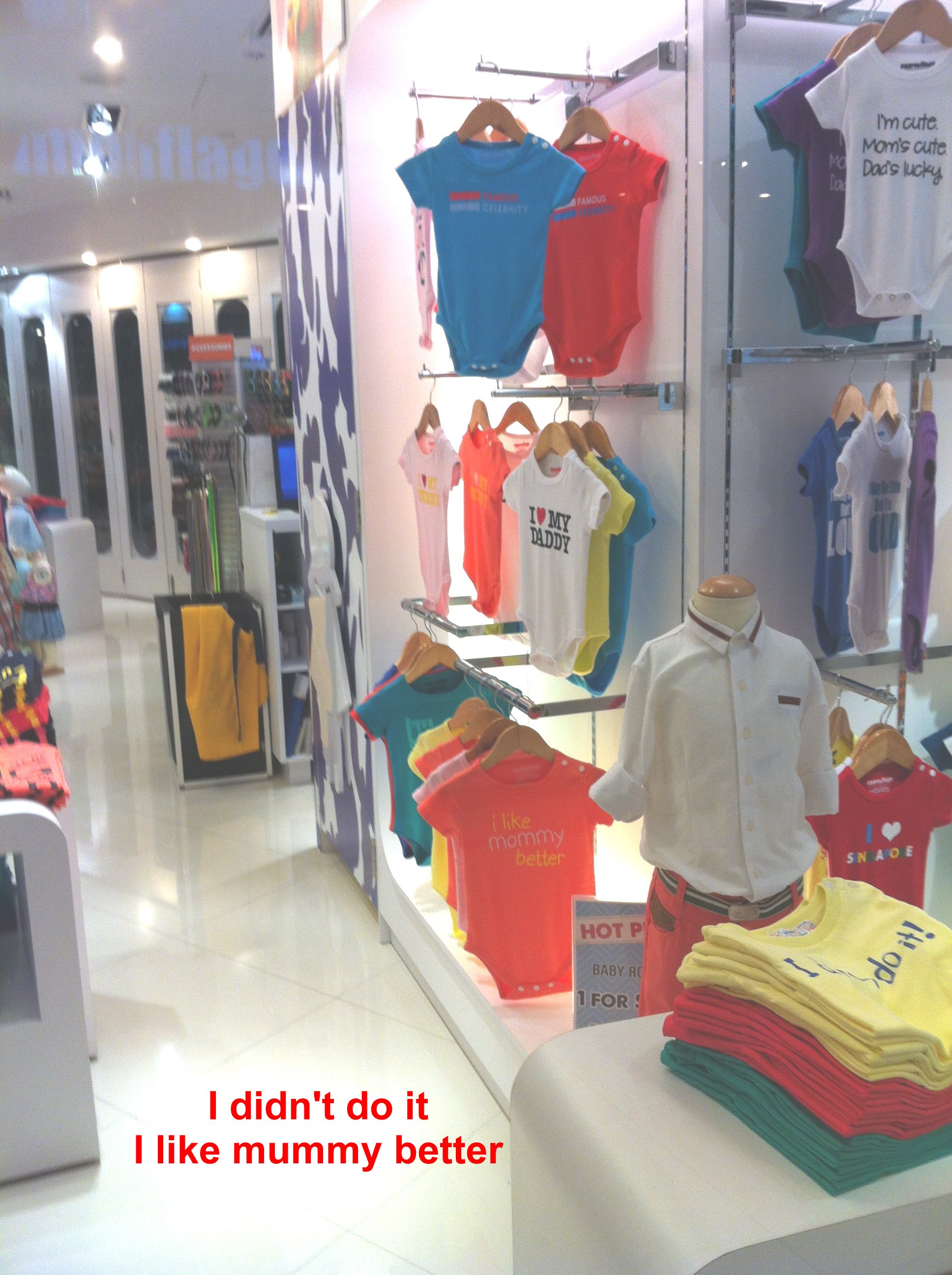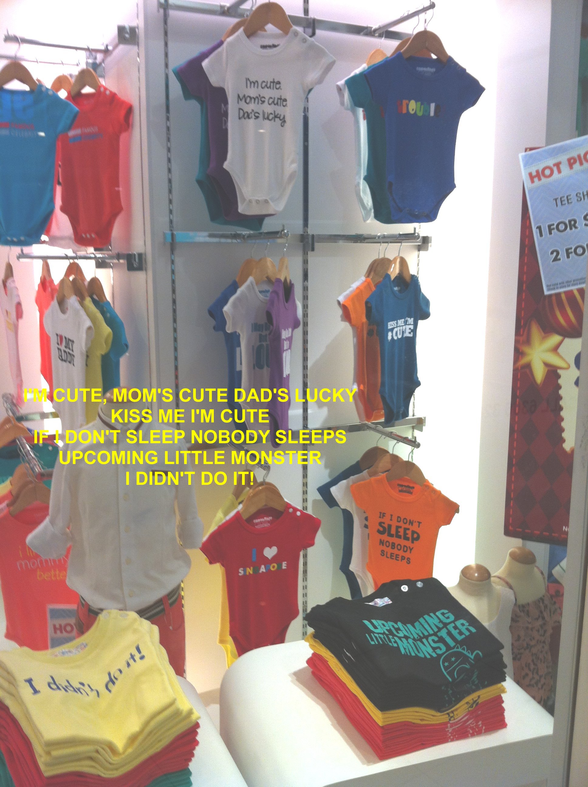 Posted January 4, 201312 yr Staff Passing by I12 Katong and saw:An interesting collection of baby-tots T-shirts...Loving and somewhat cheeky!Location: Upmarket shopping centre: I12 Katong