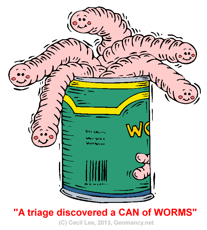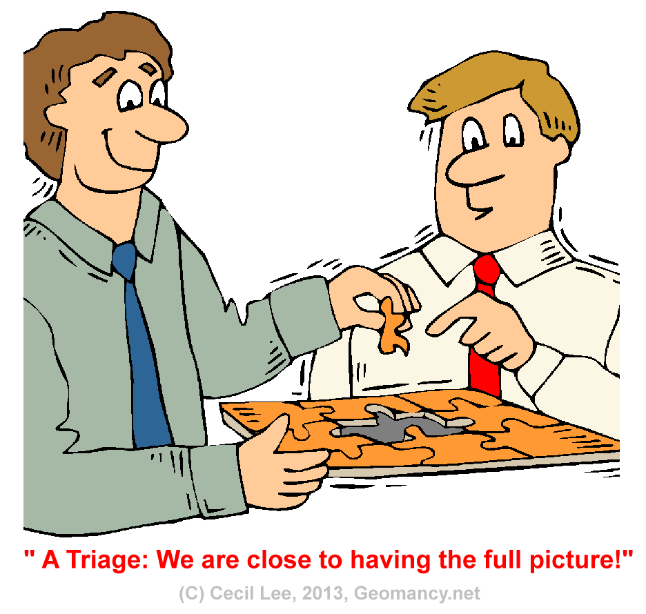 Posted April 25, 201312 yr Staff A triage: discovered a can of worms in my stomach! Quote On 4/25/2013 1:35:23 PM, Anonymous wrote:We do not know what is this puzzle allabout.Slowly but surely, all the puzzlesare fitting together.On 1/7/2013 6:28:17PM, Cecil Lee wrote:In alldisciplines andprofessions, a FengShuiTriage Proper trouble-shootingis required.There is really noshort-cut if one, wants to doajob right for the firsttime.