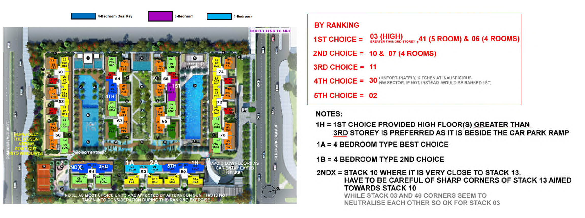 Posted January 28, 201313 yr Staff A recent exercise on the ranking of the Five and Four bedroom types at La Fiesta condominium at SengkangSomehow, there is limited (facing) choices for Five and Four bedroom types in this development.And "unfortunately" these larger stacks/units face the direct afternoon sun (not much choice thou) unless one seriously considers downsize to 3 bedrooms or 2 bedrooms. Which may not be possible for those who want larger unit types.Thus, a ranking exercise was done specifically for 5 and 4 bedroom types, here. Quote On 1/13/2013 7:47:34 AM, Anonymous wrote:This condo unit has a highpercentage of 3 bedrooms(variants) and 2 bedroomsstack.Majority of the biggerunits face the afternoon Westsun.