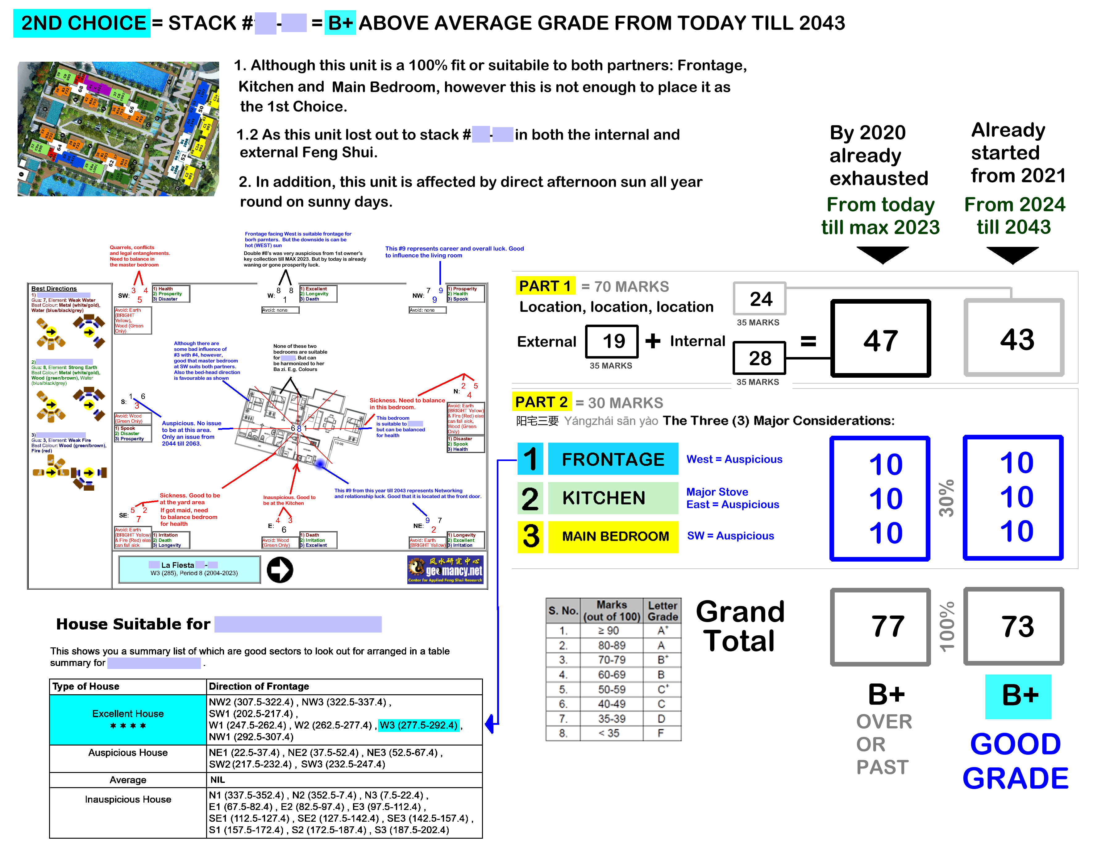Posted October 20, 201510 yr Staff Feng Shui of La Fiesta Luxury Condo at Sengkang & Flying Star Feng Shui 1. This development either faces N3, S3, E3 or W3. 2. From now to 2023, in general (other than the limited choice for 4 and 5 bedroom types); S3 facing flats have the double auspicious #8 stars at it's frontage (standing inside the living room looking outwards). 2.1. Thus from a Flying Star point of view; stacks e.g. 43, 48, 49, 52, 25, 28 & 30 for example are considered the better units. 2.2. As compared to N3 facing stacks such as stack 39 & 54 etc.. Quote On 1/28/2013 10:00:08 PM, Anonymous wrote: >This>condo unit has a high >percentage of>3 bedrooms >(variants) and 2 bedrooms>>stack.Majority of the bigger>>units face the afternoon West>>sun.