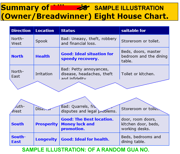 Posted March 16, 201312 yr Staff These are some considerations:- 1. You wrote: Is it true? 1.1 Yes, if you are strictly applying the Gua or Eight House; 1.2 It can be classified into: 1.3 The direction / Location significance / Status (good or bad) and even suitable for what purpose (if any). 2. Attached please find a sample illustration of a random Gua number and it's associations. 3. The rest of the questions are beyond this forum. 4. You also wrote: "Kindly advise asap as we are going to view this coming Sunday...." 4.1 It is good to remind ourselves that if we do have a time constraint; spare a thought for others. As they also have time constraints. Courtesy begets Courtesy especially incessant sms messages, one after another even till late in the evening without due regard to check if others are busy or not. Quote On 3/14/2013 6:33:11 PM, Anonymous wrote:Hi,I stumbled upon your forumwhile researching on Dahliapark.We are going to view afew units there but these arebasically same direction atstack 08As both me and my hbto be are Kua Number 4 -- Iread that Main door / balcony- front window should notface/located any of theinauspicious directions --North West / South West/ Westand North East.Bed Rooms andmain facing are best tobe in the East or any of theauspicious directions -- SouthEast, North, South.Is ittrue?I believe for Dahlia parkstack 08 (type H), the frontwindow is facing South West,while the Main door is facingNorth East.Stack 08 however isthe best stack as per yourprevious posting .. wherewealth leaks towards thisunit. (wealth leakage fromstack 24 to 27)** Also notethat there is a house shelterin the middle of the livingroom.....On a side note :Ferraria Park -- we going toview one unit there.. stack 9--- with rooms in the West,while the main door is atSouth east, balcony at NorthWest..Kindly advise asap as weare going to view this comingSunday....Thank you.