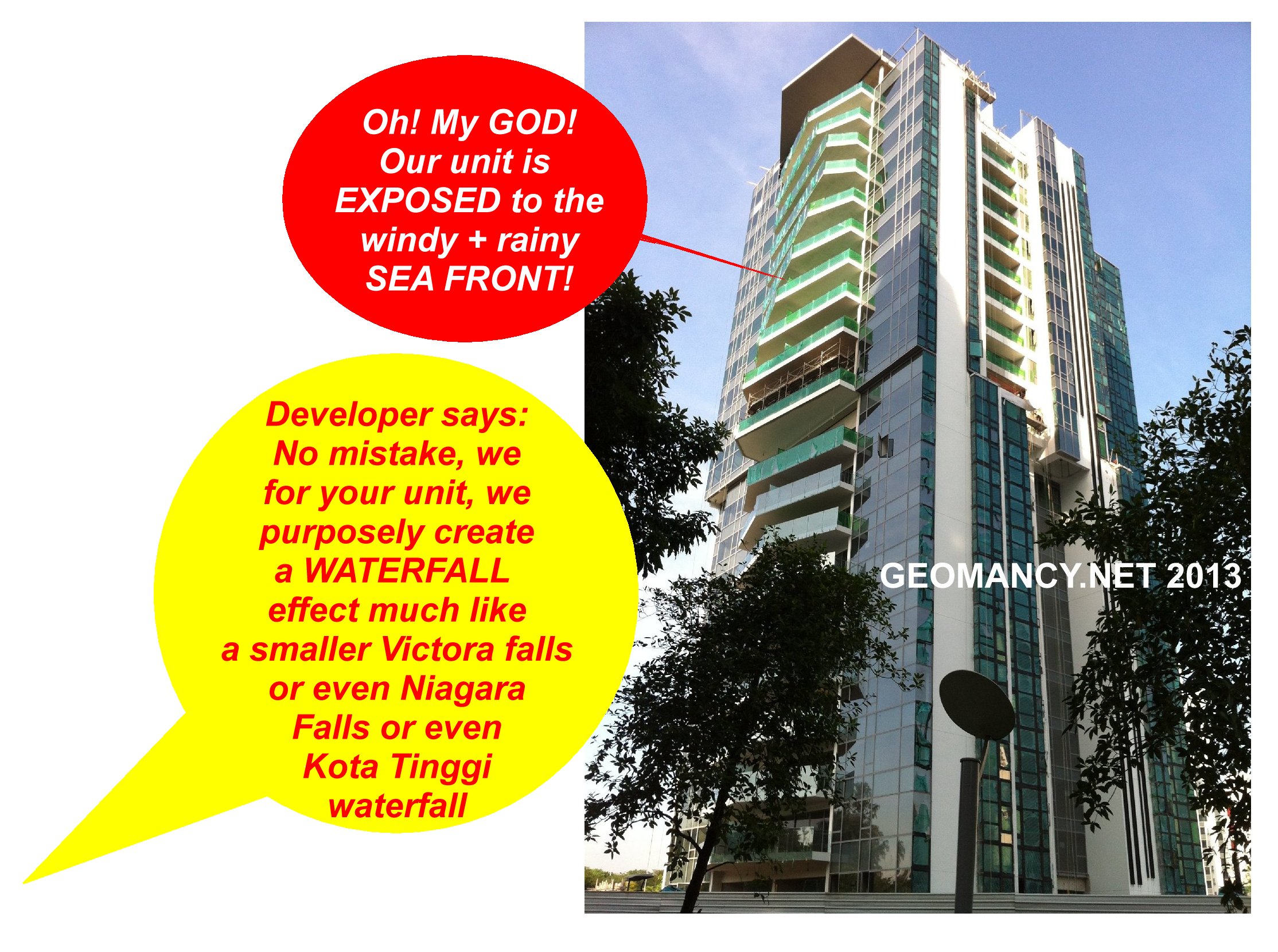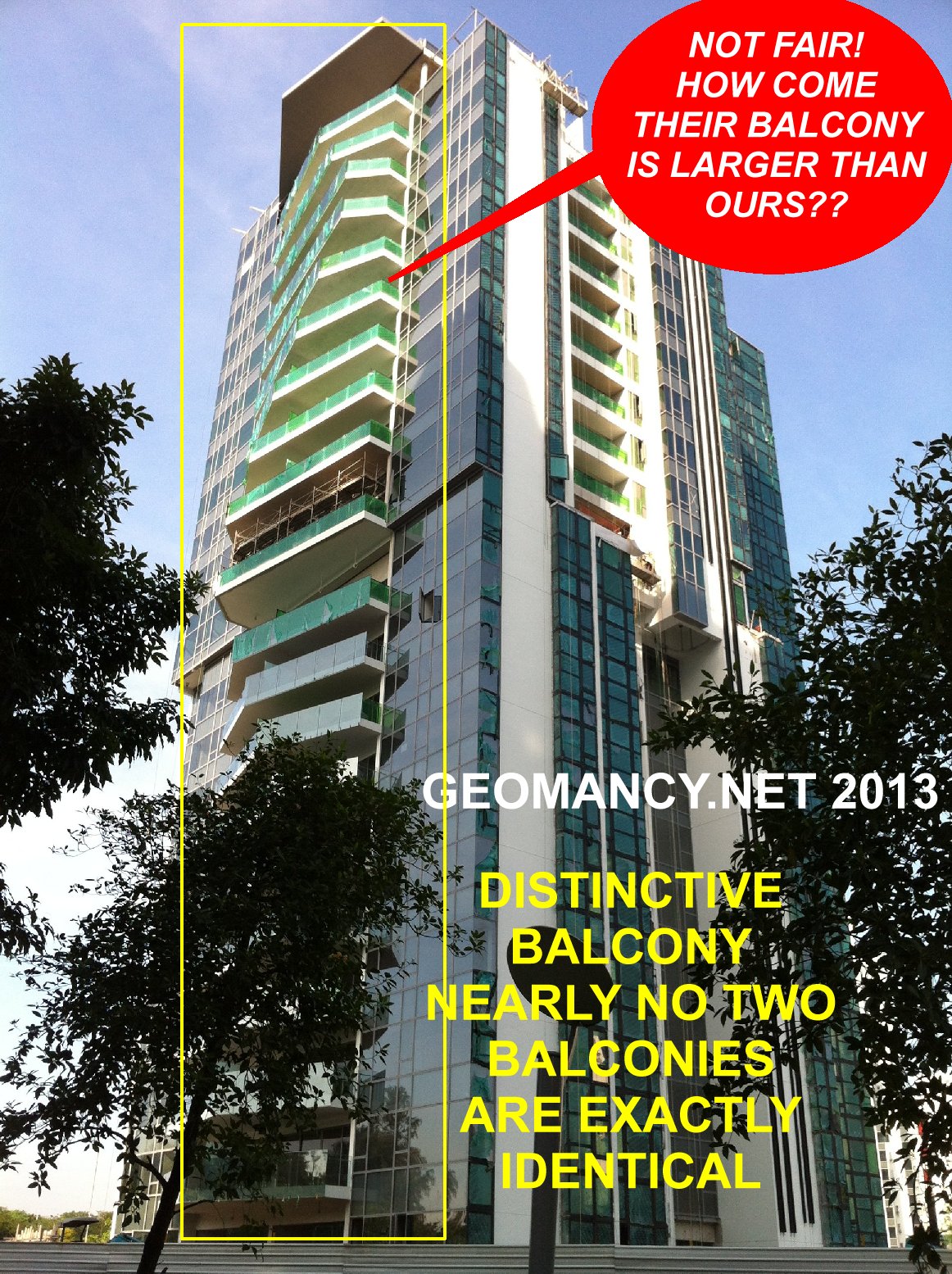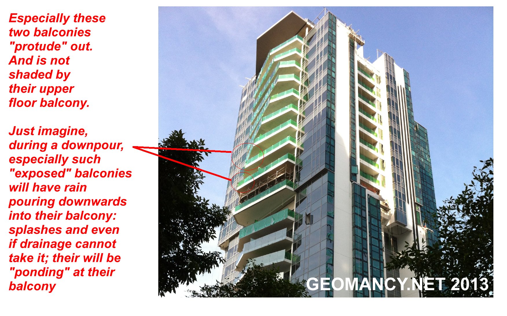 Posted April 23, 201312 yr Staff 1. In my opinion, although, some architects try to do something out of the ordinary. 2. But I feel that some of these architects continue with: YOU STAY THERE, WE DON'T.2.1. To some of these architects, to them looking good is better than all the future inconveniences thrown at the future owner of the unit.2.2. Just take a look at the attachments.2.3. Some of the balconies on the lower floor has their balcony uncovered or not protected by a balcony above it.2.4. The common sense reason is that if possible, all balconies are of the same size or if not; the upper floor balcony should be larger than the one lower them. Not exposed, as shown in the red circle(s).3. Shapes and Forms Feng Shui is about seeing (imagine) the flow of qi : be it wind or WATER. In this case, RAIN FALL. 4. Good luck to those units that will not only get "ponding" every 50 years but rather, each time there is heavy rainfall. And GOOD LUCK to you! Quote On 4/23/2013 8:12:09 AM, Anonymous wrote:How come all my neighbour's balconiesare much larger than mine?And allbalconies are NON-identical? Don't tellme that by doing so, one can claim thatit is a designer luxury condo?For a 99year old development; and after paying ahuge amount for the enbloc site; thisseems to be over-priced!On 4/23/20138:01:44 AM, Cecil Lee wrote:SilverseaCondominium:Silverseais99-year Leasehold condominiumat 50A Marine Parade RoadSingapore 449266 in District15.Its expectedcompletionis in 2014 with atotal of 383 unitsand 21storeys high.(Formerly, usedto be HUDC Amberville -Enbloc)Highly unusual entranceas it is at the round-about.Theentrance and exit, thatis.Personally, I don't likesuch anentrance /exit. Andit's neighbour(also built) bythe same developerThe Cape(freehold), suffers evenpoorer Shapes and Forms FengShui.Photos was taken,yesterdayfrom CoteD'Azurcondo.