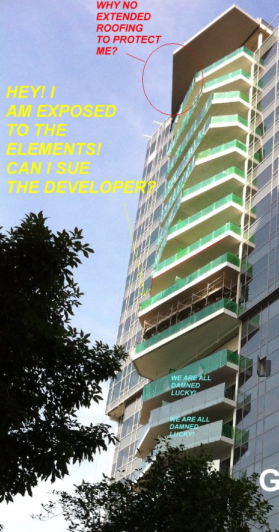 Posted June 27, 201312 yr Staff Unlike the Silversea, majority or all the living room balconies have a large and friendly roof shade.A practical approach to trying to keep most of the balconies directly exposed to the rainfall - at least. Quote On 4/23/2013 9:02:15 AM, Anonymous wrote:1. In my opinion, although, somearchitects try to do something out ofthe ordinary. 2. But I feel that some ofthese architects continue with: YOU STAYTHERE, WE DON'T.2.1. To some of thesearchitects, to them looking good isbetter than all the futureinconveniences thrown at the futureowner of the unit.2.2. Just take a lookat the attachments.2.3. Some of thebalconies on the lower floor has theirbalcony uncovered or not protected by abalcony above it.2.4. The common sensereason is that if possible, allbalconies are of the same size or ifnot; the upper floor balcony should belarger than the one lower them. Notexposed, as shown in the redcircle(s).3. Shapes and Forms Feng Shuiis about seeing (imagine) the flow of qi: be it wind or WATER. In this case,RAIN FALL. 4. Good luck to those unitsthat will not only get "ponding" every50 years but rather, each time there isheavy rainfall. And GOOD LUCK to you!On4/23/2013 8:12:09 AM, Cecil Lee wrote:How come all my neighbour'sbalconiesare much larger thanmine?And allbalconies areNON-identical? Don't tellme that bydoing so, one can claim thatit is adesigner luxury condo?For a 99yearold development; and after paying ahuge amount for the enbloc site;thisseems to be over-priced!On4/23/20138:01:44 AM, Cecil Leewrote:SilverseaCondominium:Silverseais99-year Leasehold condominiumat 50A Marine Parade RoadSingapore 449266 in District15.Its expectedcompletionis in 2014 with atotal of 383 unitsand 21storeys high.(Formerly, usedto be HUDC Amberville -Enbloc)Highly unusual entranceas it is at the round-about.Theentrance and exit, thatis.Personally, I don't likesuch anentrance /exit. Andit's neighbour(also built) bythe same developerThe Cape(freehold), suffers evenpoorer Shapes and Forms FengShui.Photos was taken,yesterdayfrom CoteD'Azurcondo.