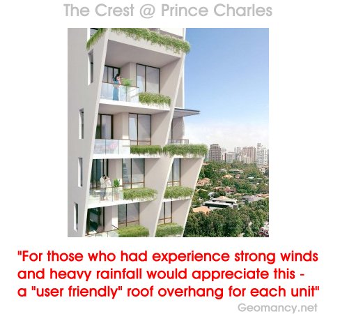 Posted November 8, 201411 yr Staff If The Quartz's overhang is great; The Crest's nice "V" shaped design that mimic those of a bamboo tree is even more impressive. "For those who had experience strong windsand heavy rainfall would appreciate this - a "user friendly" roof overhang for each unit" "Furthermore Individual - point-blocks are relatively safe designs inthe realm of Shapes and Forms Feng Shui. In addition, kinda like the "V-shaped profilewhere each balcony is sheltered from the rain" Quote On 6/27/2013 8:55:11 PM, Anonymous wrote: Unlike the Silversea, majority or all the living room balconies have a large and friendly roof shade.A practical approach to trying to keep most of the balconies directly exposed to the rainfall - at least.On 4/23/2013 9:02:15 AM, Cecil Lee wrote: >1. In my opinion, although, some >architects try to do something out of >the ordinary. 2. But I feel that some of these architects continue with: YOU STAY >THERE, WE DON'T.2.1. To some of these >architects, to them looking good is >better than all the future inconveniences thrown at the future owner of the unit.2.2. Just take a look >at the attachments.2.3. Some of the >balconies on the lower floor has their >balcony uncovered or not protected by a >balcony above it.2.4. The common sense >reason is that if possible, all >balconies are of the same size or if >not; the upper floor balcony should be >larger than the one lower them. Not >exposed, as shown in the red >circle(s).3. Shapes and Forms Feng Shui >is about seeing (imagine) the flow of qi >: be it wind or WATER. In this case, >RAIN FALL. 4. Good luck to those units that will not only get "ponding" every >50 years but rather, each time there is >heavy rainfall. And GOOD LUCK to you!On >4/23/2013 8:12:09 AM, Cecil Lee wrote: >>How come all my neighbour's >balconies >are much larger than >mine?And all balconies are >NON-identical? Don't tell >me that by >doing so, one can claim that >it is a designer luxury condo?For a 99 year >old development; and after paying a >>huge amount for the enbloc site; >this >seems to be over-priced!On >4/23/2013 >8:01:44 AM, Cecil Lee >wrote: Silversea Condominium:Silversea >is 99-year Leasehold condominium at 50A Marine Parade Road Singapore 449266 in District 15.Its expected completion >is in 2014 with a total of 383 units >and 21 storeys high.(Formerly, used to be HUDC Amberville - Enbloc)Highly unusual entrance >>>as it is at the round-about. >>The >entrance and exit, that >>is. Personally, I don't like such an >entrance /exit. And it's neighbour >(also built) by >>the same developer >The Cape >>(freehold), suffers even poorer Shapes and Forms Feng Shui.Photos was taken, yesterdayfrom Cote D'Azur >condo.