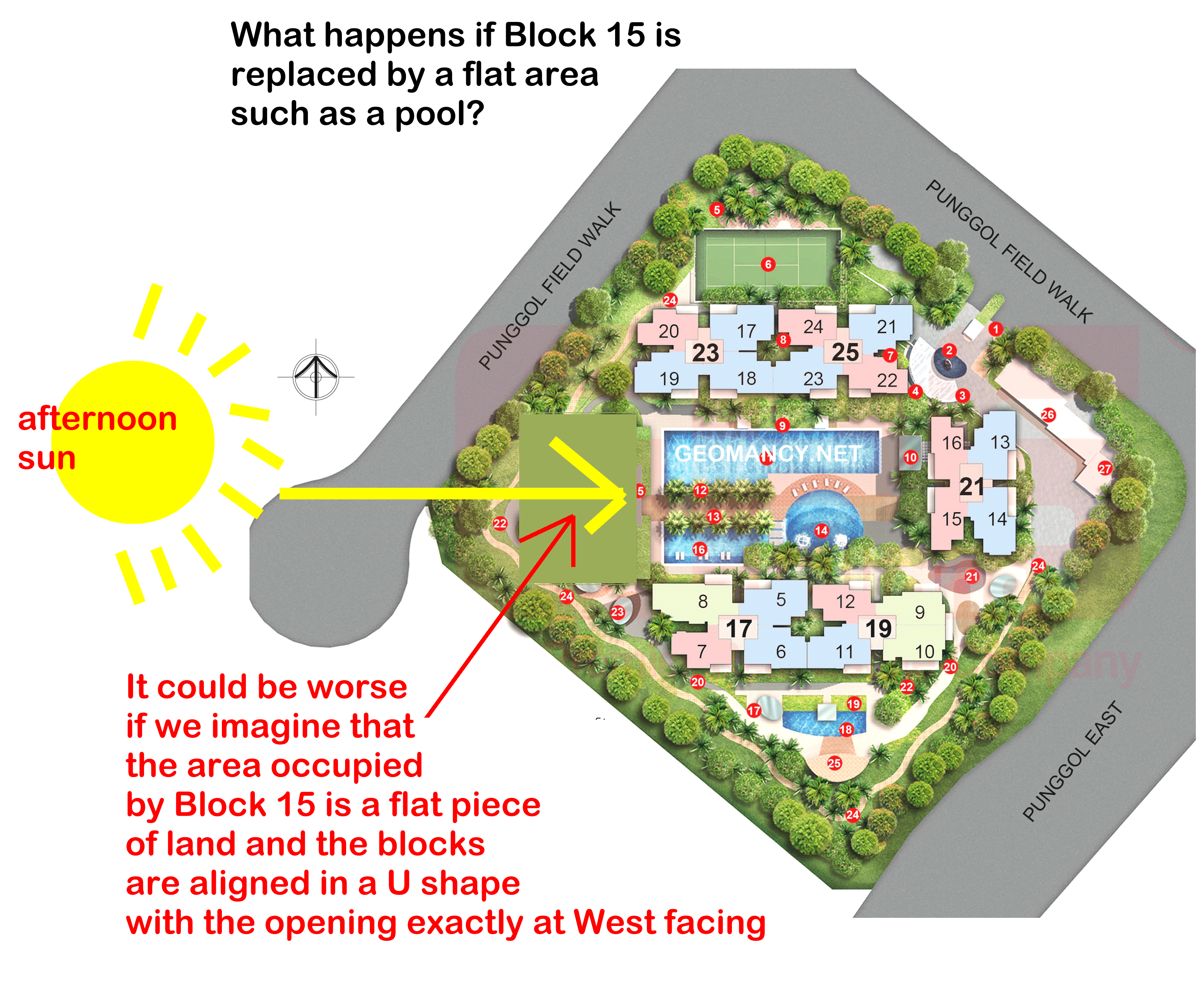 3.Block D partially blocks the morning sun rays towards the main pool.