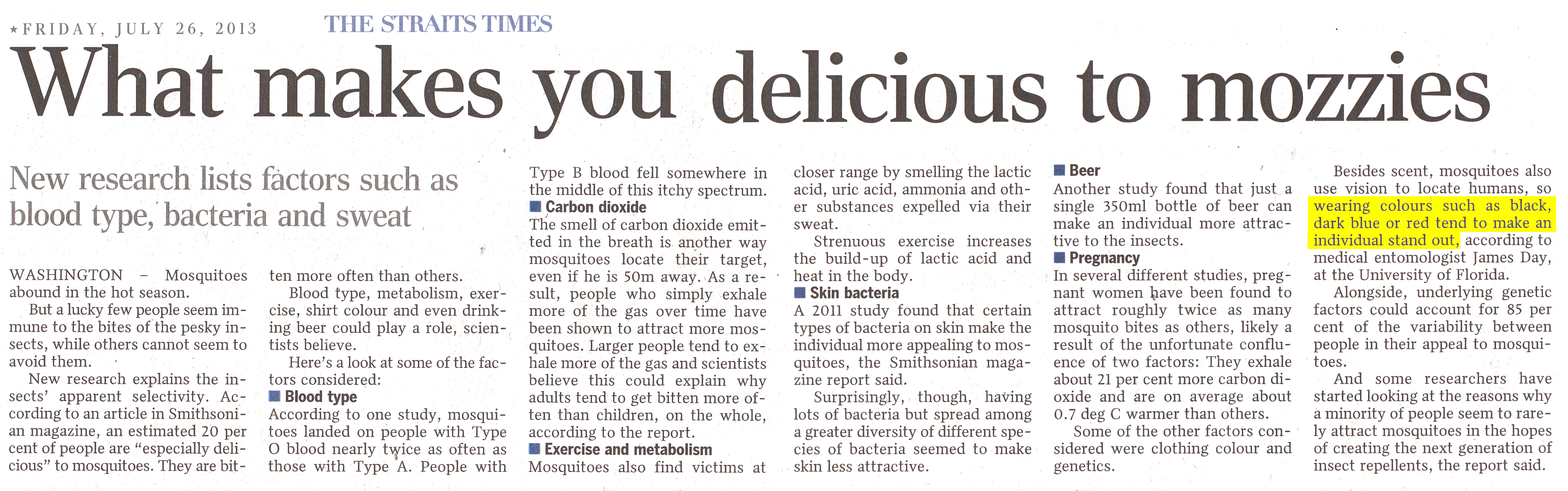Posted July 28, 201312 yr Staff What makes you delicious to mosquitoes?New research lists factors such as blood type, bacteria and sweat.WASHINGTON - Mosquitoes abound in the hot season.New research explains the insects' apparent are selectivity. Mosquitoes particularly like black, blue and red colours.
