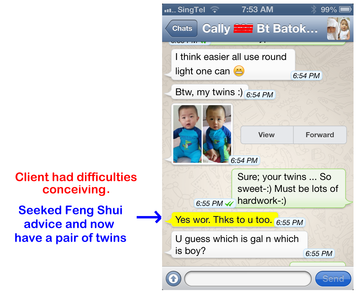 Posted August 2, 201312 yr Staff Previously, she has problems having children.After Feng Shui consulation, she had two lovely twins: a boy and a girl.Feng Shui cannot guarantee success. But, can help to further improve chances especially if there are any imbalances in one's home.Had another case, a client who stayed in Rosewood condo. (She happens to work for a company that uses my Feng Shui service). And after the consultation, managed to have a baby boy.