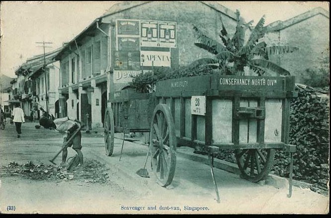 Posted September 11, 201312 yr Staff Imagine, if we were in the 1910's walking along the streets of Singapore; we might see a well organized worker clearing the streets.In the picture is a hard-working civil servant; some regard him as a scavenger. And he is clearing and cleaning the streets of North division.In the back-drop is the dust-van. Today, we might call this a dump-truck. Much like those placed outside a premises to haul away debris and yes, dust from the work-site (renovations or A and A works)