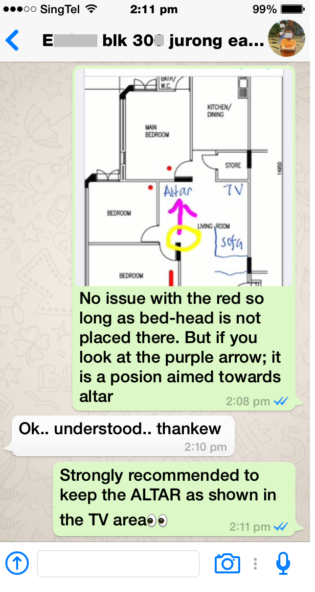 Posted December 27, 201411 yr Staff 1. Please see attachments.2. In one of the attachments "in red": A, B, X and Y.2.1. Originally, the recommended altar 1st choice position was in position A. Or at worst position B.2.2. Client asked whether she could position the altar at location Y. In the illustration; one can see that if the bedroom door is in an open position; the pillar at marking X would become a poison arrow (sha qi) aimed towards the proposed altar location. Which is not ideal.