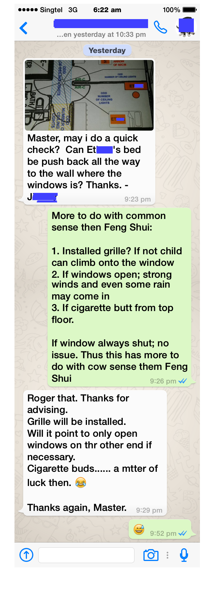 Posted May 23, 201510 yr Staff Question: Master, may I do a quick check? Can son's bed be pushed back all the way to the wall where the window is? Reply: More to do with common sense then Feng Shui: 1. Installed grille? If not child can climb onto the window. 2. If windows open; strong winds and even some rain may come in. 3. If cigarette butt from top floor. If window always shut; no issue. Thus this has more to do with cow sense then Feng Shui.