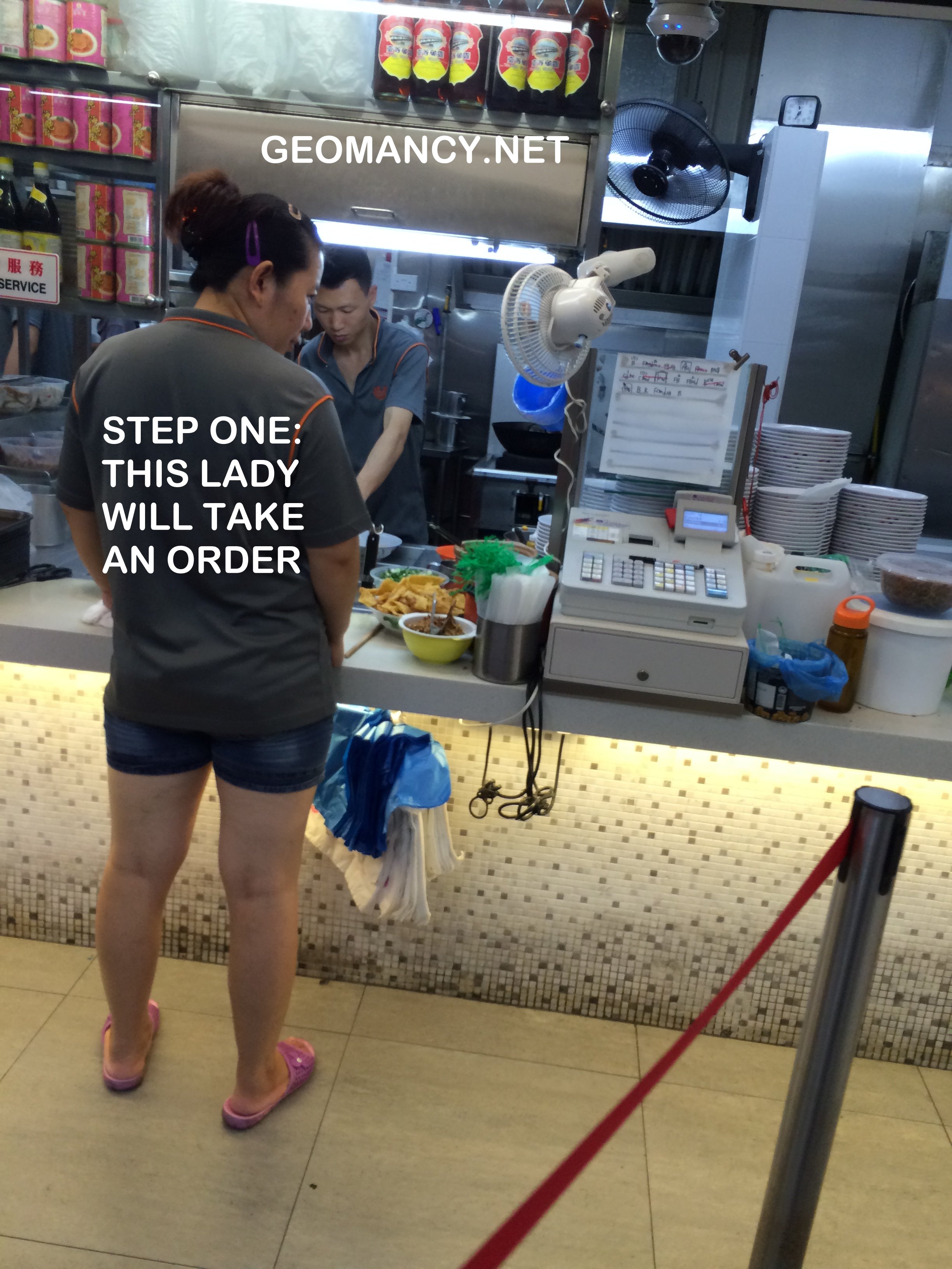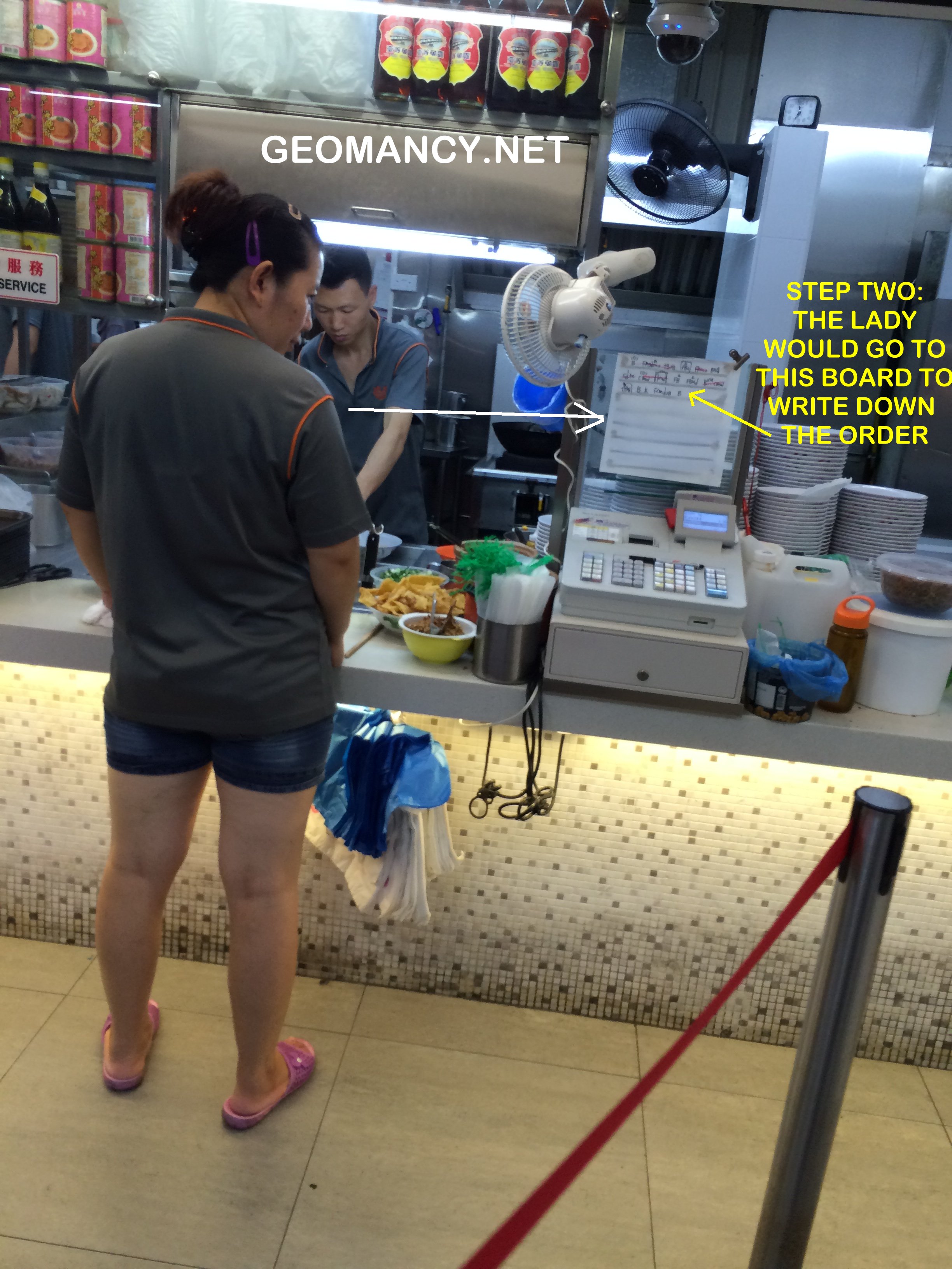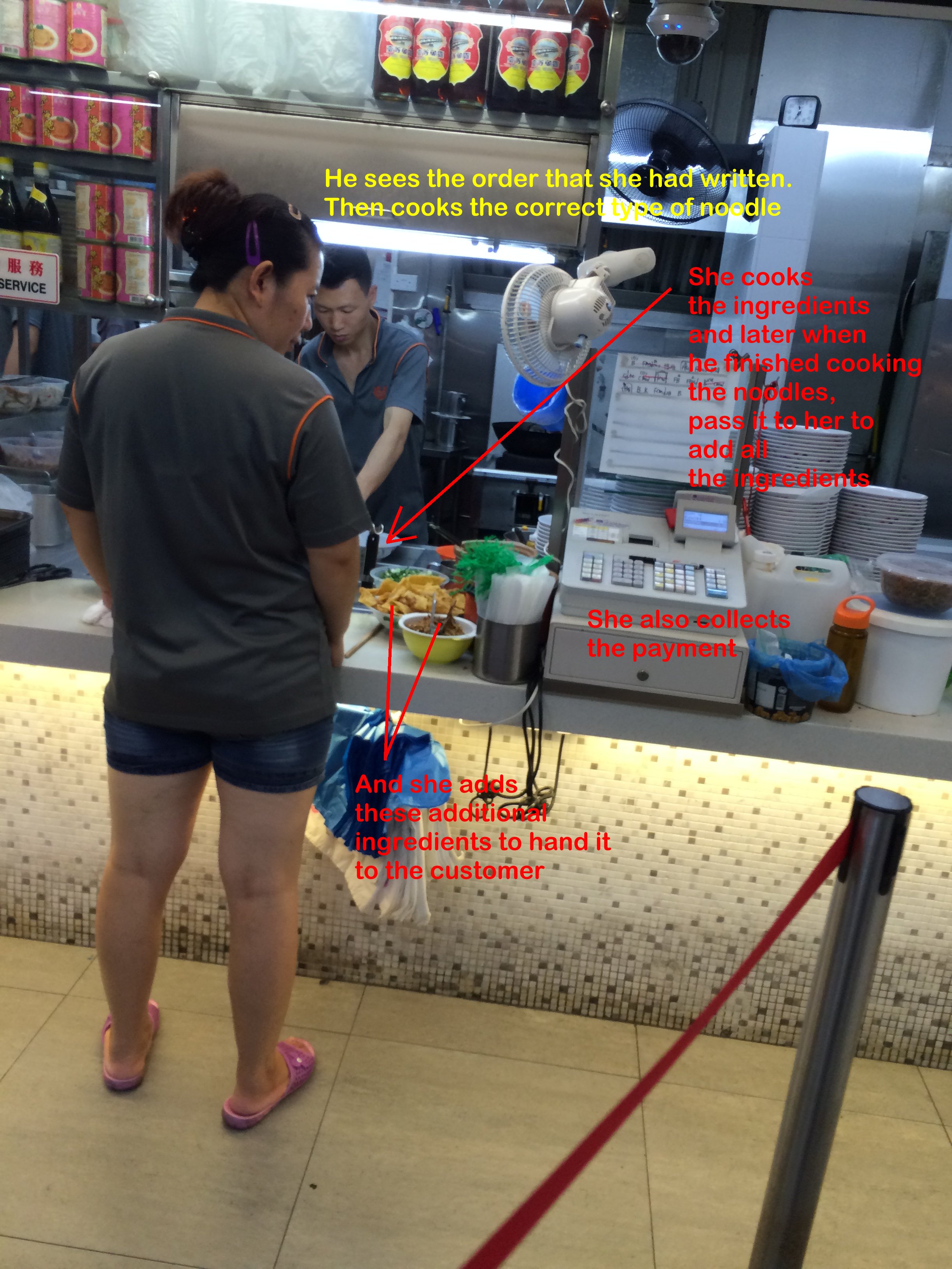 Posted June 28, 201510 yr Staff Case Study: Organisation and Methods (O & M) Actually, the essence of this efficiency can be summed up in justtwo photo slides. See attachment Quote On 6/28/2015 5:06:11 PM, Anonymous wrote: I am truly impressed with this food staff staff selling Chinese Noodle (Traditional Teochew Mee Pok).I find that the staff had applied creative thinking or rather truly think out of the box!Step 1: The helper would take down an order.Step 2: She goes to this "glass panel" where she placed a thin sheet of paper. For example, I wanted a bowl of "flat" mee pok noodle; she would write in bold black "BUX". Here, the mee pok is identified as "B". And as I wanted NO OIL; the UXmeans No oil.Step 3: At the food preparation station; theman (staff) can see the order that she had written down at his side andsomehow; as the writing is both bold and large;he could actually figure out what I had wanted. And prepared my bowl of noodles without both uttering a single word. Contrast this to Gordon Ramsay's adage thattheCoordinator must shout out the order! Here, not a single word was uttered!How'sthis for utter efficiency!Step 4: When thelast order was completed. The helper taking the order would use another red bold marker and cancel to the last completed order. And this would certainly helpfood preparation staffto note when to start preparing food again.Another remarkable division of labour is that when theman behind the counter prepared the noodle; the helperalsohas another job; that is to cook theminced meat, fish balls etc.. inhot water andwhen she received the cooked bowl of mee from him; she will place the ingredients to the bowl to complete the full mee pok package to hand over to thepurchaser.There are many other methods of telling the cook what to prepare. Some would use coloured tokens e.g. a red token means customer wants extra chili; and a piece of type of noodle on this token to denote what the client needed. This is far too common.Thus, I am truly impressed with this set-up. Which is truly one- of a kind! However, their chilli gravy is so so. Good thing is you are allowed to add as much as you want. Always leave a not do complimentary after-taste. Nowadays, I skip this place totally.