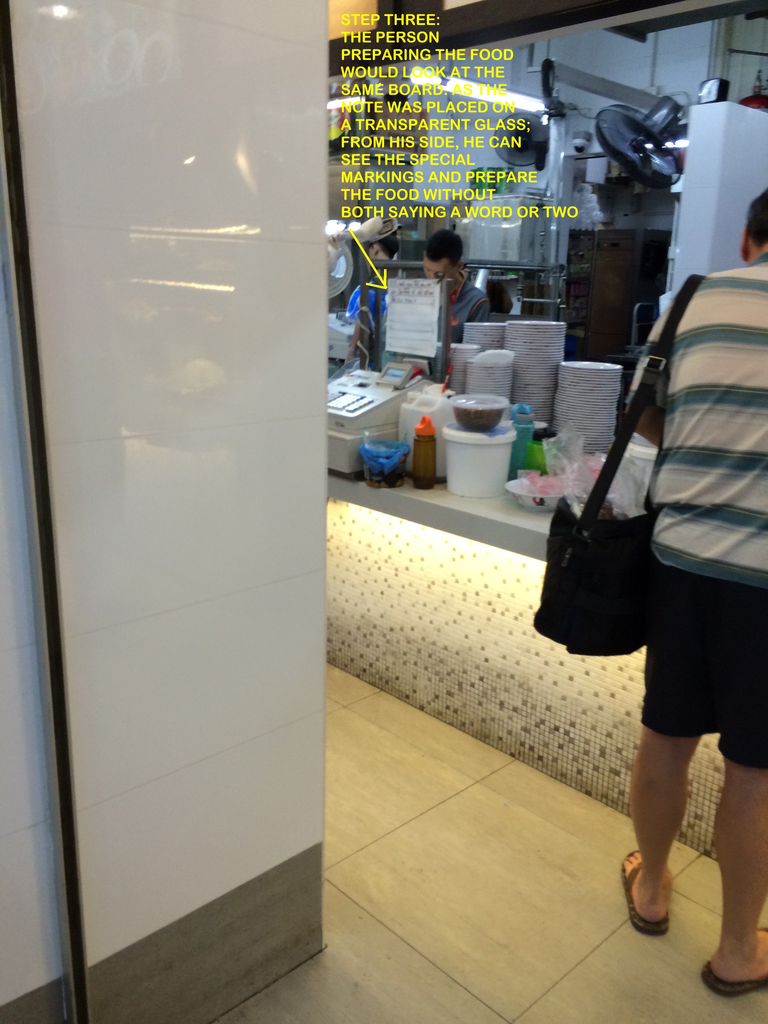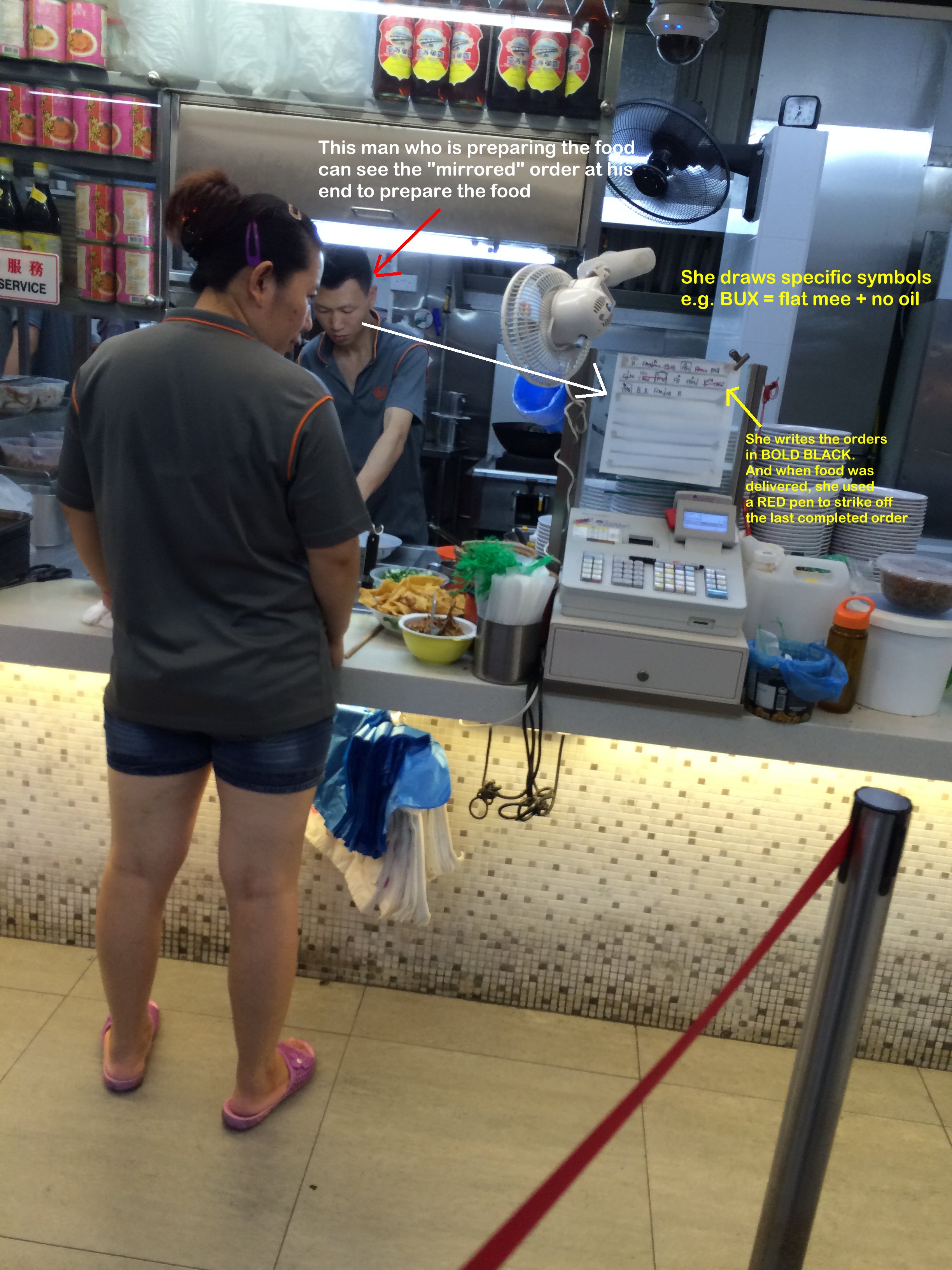 Posted June 28, 201510 yr Staff I am truly impressed with this food staff staff selling Chinese Noodle (Traditional Teochew Mee Pok). I find that the staff had applied creative thinking or rather truly think out of the box! Step 1: The helper would take down an order. Step 2: She goes to this "glass panel" where she placed a thin sheet of paper. For example, I wanted a bowl of "flat" mee pok noodle; she would write in bold black "BUX". Here, the mee pok is identified as "B". And as I wanted NO OIL; the UXmeans No oil. Step 3: At the food preparation station; theman (staff) can see the order that she had written down at his side andsomehow; as the writing is both bold and large;he could actually figure out what I had wanted. And prepared my bowl of noodles without both uttering a single word. Contrast this to Gordon Ramsay's adage thattheCoordinator must shout out the order! Here, not a single word was uttered! How'sthis for utter efficiency! Step 4: When thelast order was completed. The helper taking the order would use another red bold marker and cancel to the last completed order. And this would certainly helpfood preparation staffto note when to start preparing food again. Another remarkable division of labour is that when theman behind the counter prepared the noodle; the helperalsohas another job; that is to cook theminced meat, fish balls etc.. inhot water andwhen she received the cooked bowl of mee from him; she will place the ingredients to the bowl to complete the full mee pok package to hand over to thepurchaser. There are many other methods of telling the cook what to prepare. Some would use coloured tokens e.g. a red token means customer wants extra chili; and a piece of type of noodle on this token to denote what the client needed. This is far too common. Thus, I am truly impressed with this set-up. Which is truly one- of a kind!