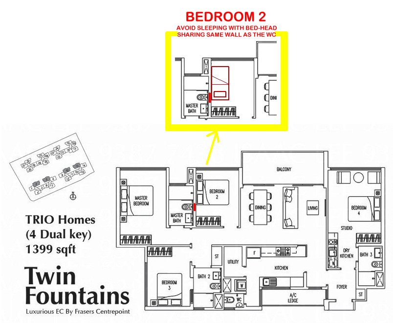 Posted October 13, 201510 yr Staff Part 1: Feng Shui of Twin Fountain EC - Interior layout 1. 4 (bedroom) Dual Key Deluxe model: The architect did a FAIRLY reasonable job in the placementof the various toilets especially the WC: where it does not sharethe same wall as the bed-head or stove. 2. 4 (bedroom) Dual Key model: The overall layout of the interior is good. However, for Bedroom 2, try to avoid sleeping with the head (bed-head) sharing the same wall as the WC. Reference: Attachments