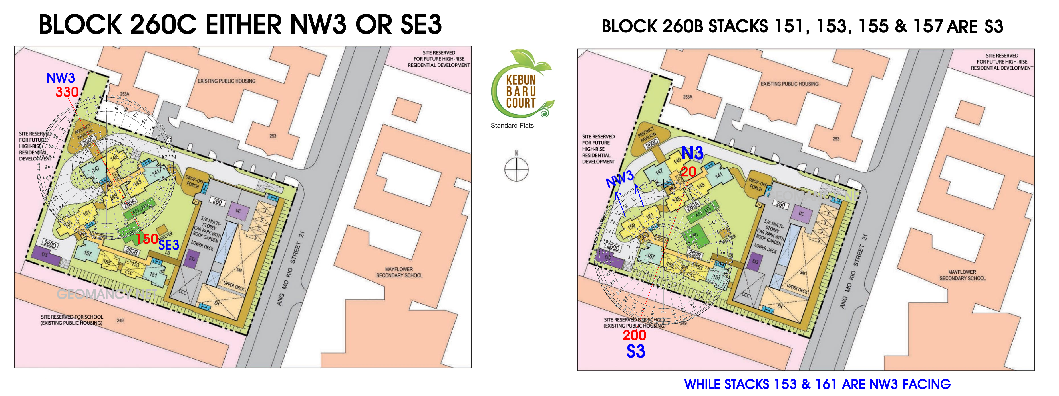 Posted October 23, 201510 yr Staff Feng Shui of HDB Kebun Baru standard flats 1. Block 260B Stacks 151, 153, 155 & 157 are S3. While stacks 153 & 161are NW3 facing 1.1 These S3 Stacks151, 153, 155 & 157 are the best stacks for a East group person. As both frontage enjoys the double auspicious #8 wealth stars. And furthermore their facing directions has water. Bring great wealth. 2. Block 260C Stacks are eitherNW3 OR SE3