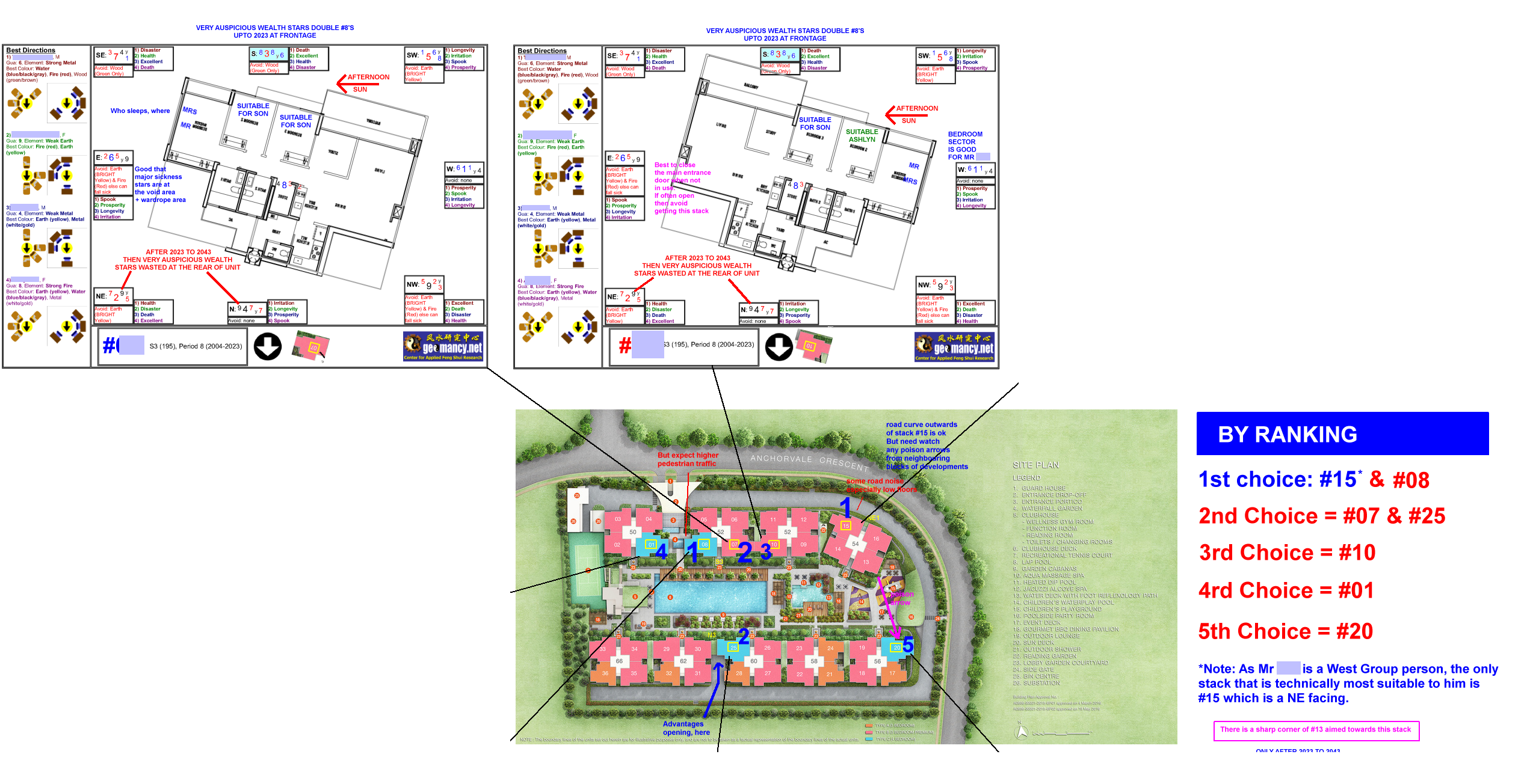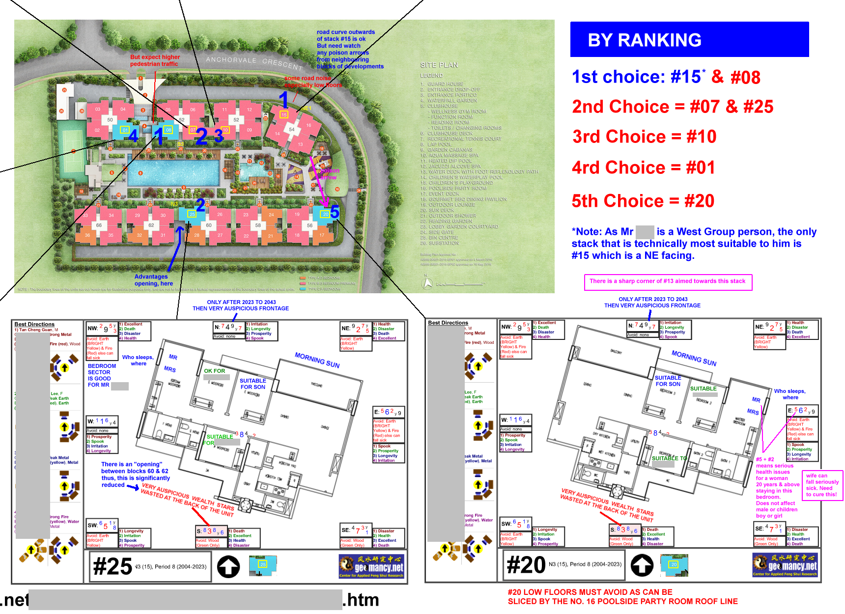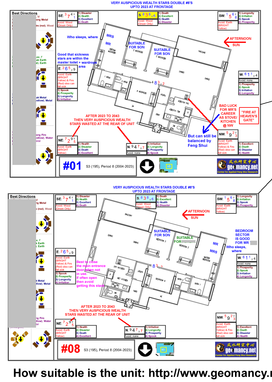 November 14, 20232 yr Author Staff AS WE ENTER PERIOD 9 FLYING STAR FENG SHUI FROM 2024 TILL 2043 IS MY UNIT STILL LUCKY FROM 2024 ONWARDS? OR CAN OR CANNOT BUY? Part 1: How is the luck of the Interior Feng Shui of this unit? Part 2: External Feng Shui luck? Part 3: How suitable is the unit - Frontage, Kitchen & Main Bedroom? PART 1 = 35% Depends on the Internal Layout & Sectors - How Lucky? There are only four facing directions for this development. The Majority: There are Blocks 50 52 52 56 58 60 62 & 66 with either N3 or S3 facing units. The Rest: While Block 54 Stacks #13 & #14 are SW1 facing while stacks #15 & #16 are NE1 facing. THE BEST Purely based on Flying Star Feng Shui N3 = [Better luck under Period 9. Which is from 2024 to 2043.] +++++++++++++++++++++++ THE REST S3 = [Less lucky under Period 9. As formerly double #8's at it's frontage had now become Past or Gone Luck!] ++++++++++++++++++++++ NE1 [Less lucky under Period 9. It also depends on the layout plan.] ++++++++++++++++++++++ OH DEAR! Block 54 Stacks #13 & #14 SW1 = [Take extra care of health issues from 2024 onwards.] ++++++++++++++++++++++ But also need to review/consider the individual Internal Layout Plan & this is just part of the many considerations in a home purchase. However the above does not take into consideration things like: Kitchen/Stove at Inauspicious Fire @ Heaven's Gate or Poison arrow aimed towards the unit, proximity to common bin etc.. +++++++++++++++++++++++++++ +++++++++++++++++ ++++ PART 2 = 35% Location, location, location? Sha Qi? Poison Arrow? Watch Your Front, Sides & Back! POOR SCORE? THESE ARE SOME CONCERNS: Sha Qi or Poison arrow(s) from Sharp Corner(s) 天斩煞 (tiān zhǎn shà) = Tian Zhan Sha etc... +++++++++++++++++++++++++++ +++++++++++++++++ ++++ PART 3 = 30% How Suitable to breadwinner? Please note that has yet to take into consideration: 1. How suitable is the unit to the main breadwinner & 2. External Shapes and Forms of the unit TOTAL SCORE = 35 + 35 + 30 = 100% Get Expert Help: ++++++++++++++++++ +++++++++ How do you Feng Shui your home? Use your front door? Who are the Conservatives & the Modernist? Applies to Homes that previously T.O.P. between Years 2004 to 2023...