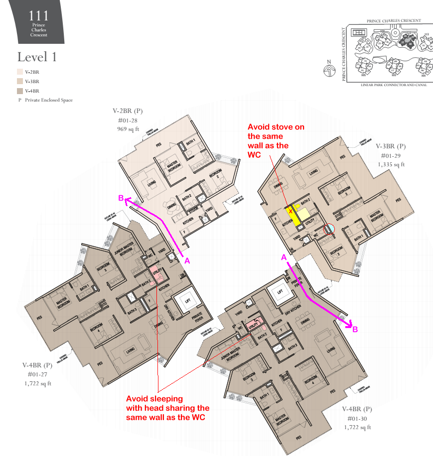 3. For stacks #01-27 and #01-30; Arrow and markings in purple A to B and vice versa shows a less than ideal Shapes and Forms situation especially if the windows are opened. This symbolises wealth leak or hard to save money.